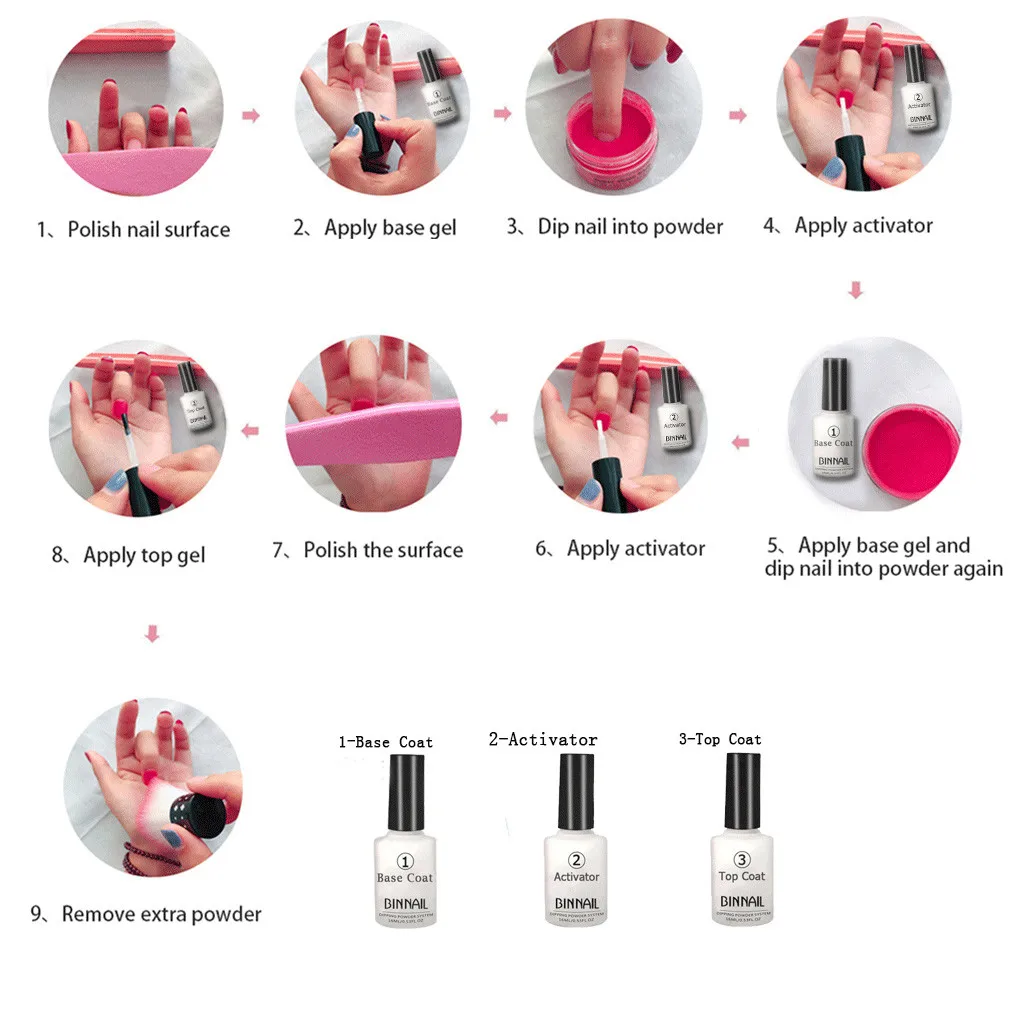 1. Уход за ногтями и полировка поверхности ногтей 2. Нанесите базовый гель и окуните гвоздь в порошок 3. Применить активатор; Повторите шаг 2, пока вы не удовлетворены 4. Полируйте поверхность, Нанесите верхний гель; Идеальный эффект для ногтейОписание:
