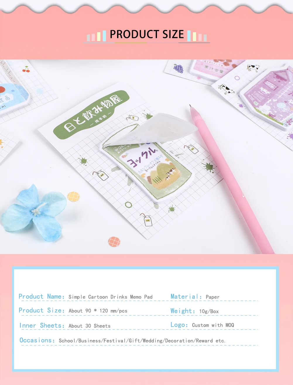 1, стиль: напиток, клубника, молоко, виноград, сок, йогурт Kawaii милые блокноты для заметок контрольный лист ежедневный график планировщик наклейки 2. Материал: бумага 3, Параметры: Вес: 10 г Размер: 40*70 мм и 90*120 мм Внутренняя страница: около 30 страниц 4. Особенности: Креативный легкий портативный многоразовый блокнот для школы и офиса 5. Функция: Напоминаем ежедневник, записывающий список, сделай сам граффити, оставляем сообщение, офисные товары для бизнеса, школьный стол для учеников, аксессуар 6, Таможня: Да, логотип is_Customized с MOQ, принимает PS(Photoshop), AI(Adobe Illustrator), CD(CorelDraw) Формат