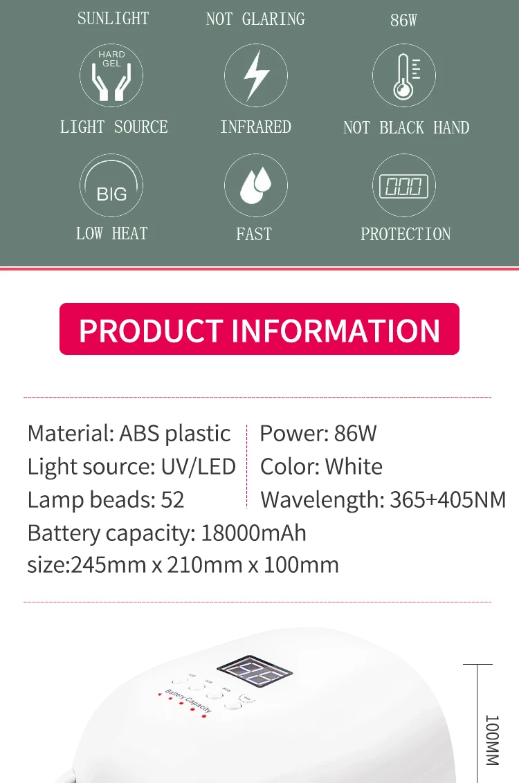 Первая в мире лампа с уникальным дизайном для отверждения большого пальца, 4 светодиода с двух сторон с идеальным углом Портативная подставка для удобной переноски Беспроводная и перезаряжаемая для удобного использования в салонах Высокая емкость батареи @ 18000mA для длительного использования Батарея работает до 10 часов после полной зарядки 4 часа Высокая мощность 86 Вт-52 шт двойной красный светильник 365 + 405nm Быстрая полная пять отверждения для всех УФ-и светодиодных гелей 5 ЖК-цифровой таймер: 10, 30, 60, 99s режим низкого нагрева Съемный опорный Лоток легко использовать для ног Активированный автоматический датчик 50000 часов жизни никогда не нужно заменить светодиодные лампы Ток на выходе: 13,5 V/2A Блок Размер продукта: 24,5*21*10 смВот впервые увидела платье, расписанное как фарфор! Прямо сразу заказала, пока не разобрали. Сидит хорошо, как на девушке с этой... Читать отзыв полностью...