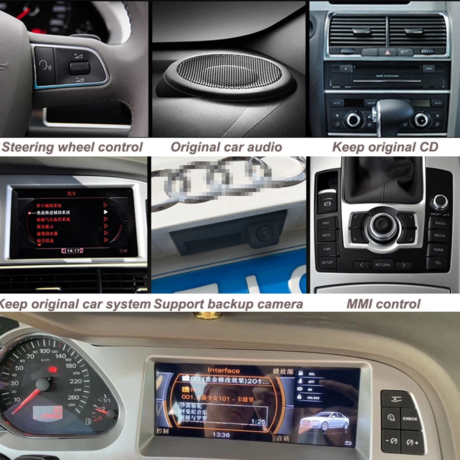 Can view the original car system interface information, dashboard display, Keep the original car CD, MMI control, steering wheel control, backup camera, original car audio.