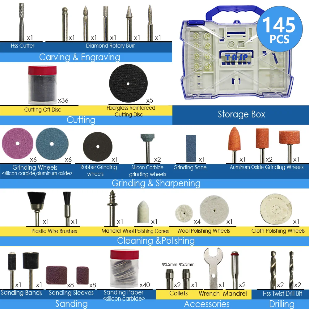 -Набор TASP 145 шт идеально подходит для самых разнообразных применений, таких как: гравировка, резьба, фрезерование, резка, шлифовка, полировка и многое другое. -Он содержит разнообразные высококачественные аксессуары, которые позволяют пользователю выполнять целый ряд применений. -Размер хвостовика: 3,2 мм (1/8 "). -Можно использовать на поворотных инструментах.