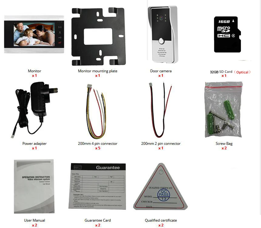 Монитор: 7 "широкий цветной HD TFT LCD ,16:9 дисплей Разрешение: 800X480 Память: поддержка внешней SD карты макс. 32 Гб Режим внутренней связи: двусторонняя связь без использования рук Задержка вызова: 120s Клавиатура: сенсорная кнопка Входная мощность: внешняя мощность DC12V Потребляемая мощность: Режим ожидания: 1 Вт; Работа: 5 Вт Материал: акриловая оболочка для волочения проволоки Запись изображения: формат jpeg; Видео: Формат avi Несколько языков: английский, русский, испанский Запись обнаружения движения: Да Видео с изображениями Ringtone Выберите из sd-карты Цифровая рамка и фоновая музыка Поддержка нескольких систем: система поддерживает 6 внутренних мониторов, 2 дверной звонок с камерой и 2 камеры видеонаблюдения
