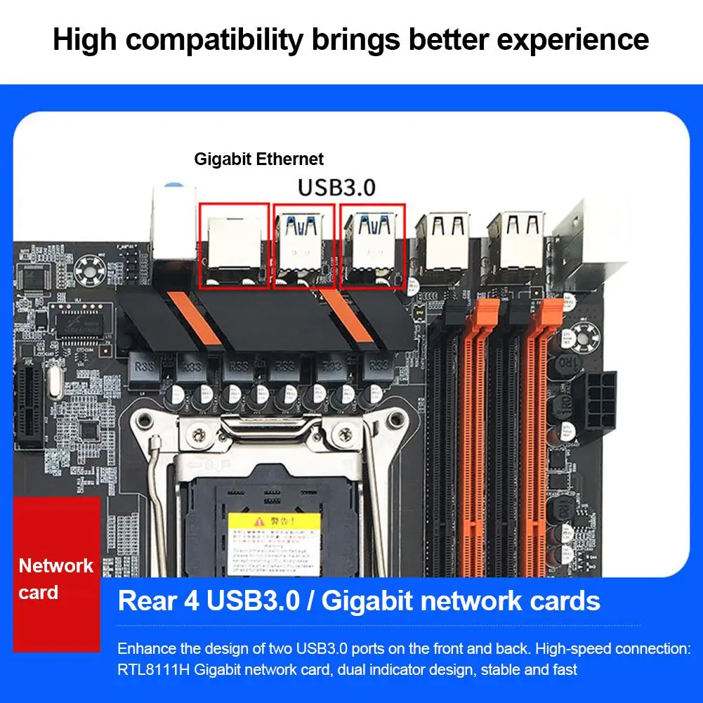 4. Высокоскоростное соединение: материнская плата улучшает дизайн двух портов USB3.0 спереди и сзади для высокоскоростного подключения.