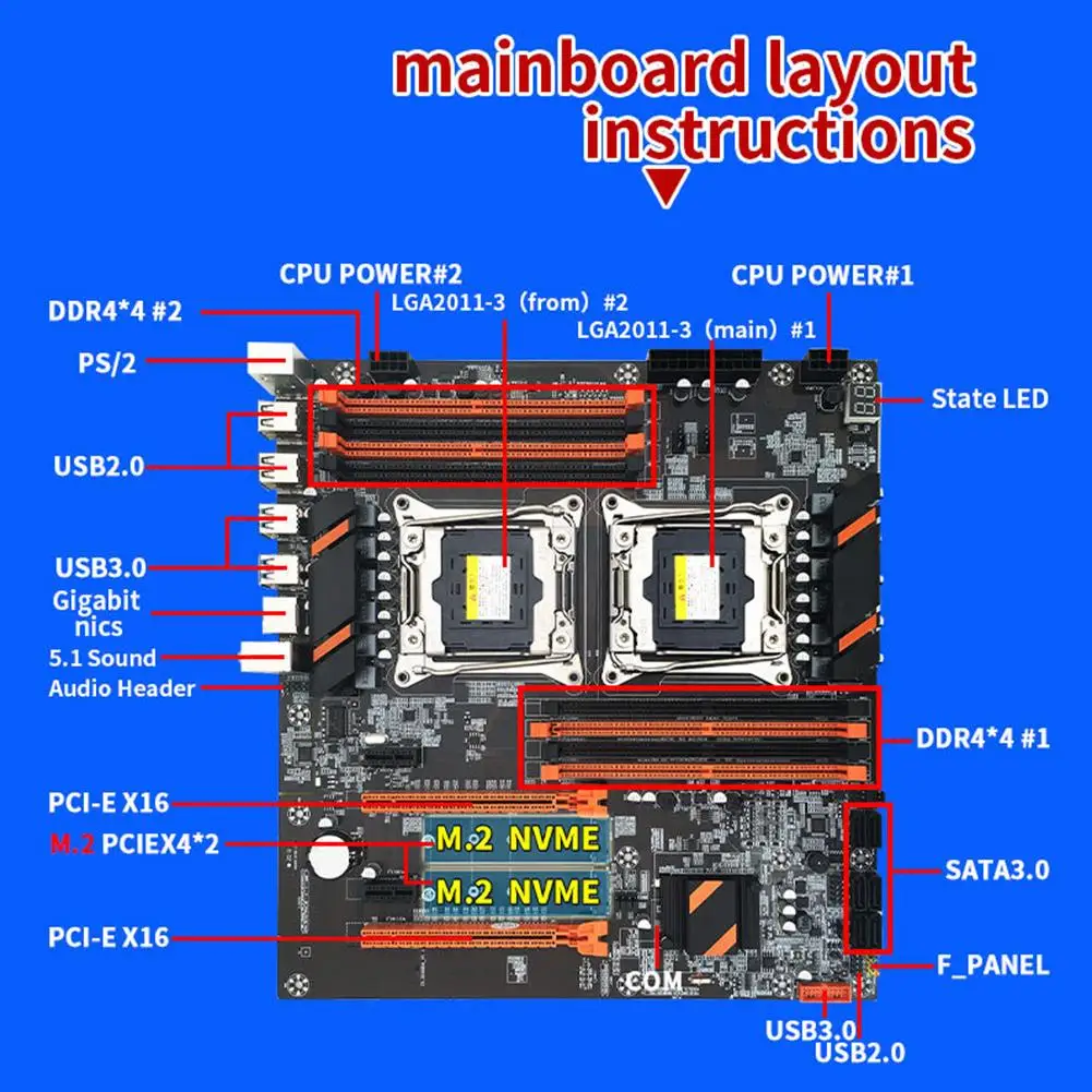 2. Широкие характеристики: материнская плата оснащена настоящим чипом X99, 8 слотами памяти DDR4, всеми твердыми конденсаторами и двумя графическими картами PCI-E.