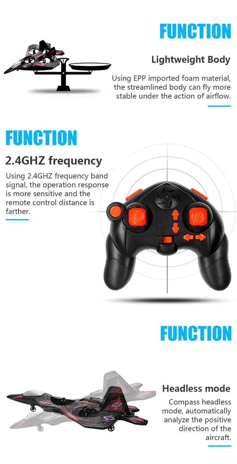 Функции: ускорение/замедление, поворот влево/вправо, Взлет/посадка одним нажатием, поворот на 360 °, полет влево/вправо, подвиг высоты.