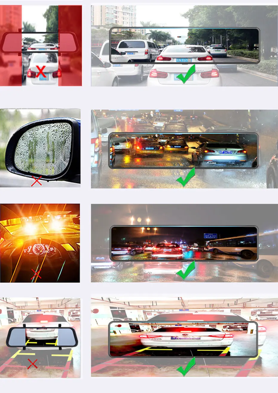 Традиционные зеркала заднего вида просто обеспечивают ограниченное поле заднего вида, большую часть времени, нам нужно повернуть голову назад, чтобы увидеть больше, особенно когда мы парковка. Видеорегистратор Streaming media позволяет избежать не только препятствий для подголовников или задних столбов, но и дает примерно в 3 раза больше стандартного зеркала заднего вида. Более того, видимость потрясающая даже в ночное время и в дождливые дни.