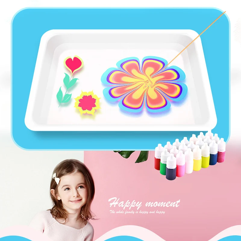 3.Легко краски:Благодаря пошаговым инструкциям вы можете легко разложить воображение детей в качестве красителей. Цветные и блестящие цветы на воде.