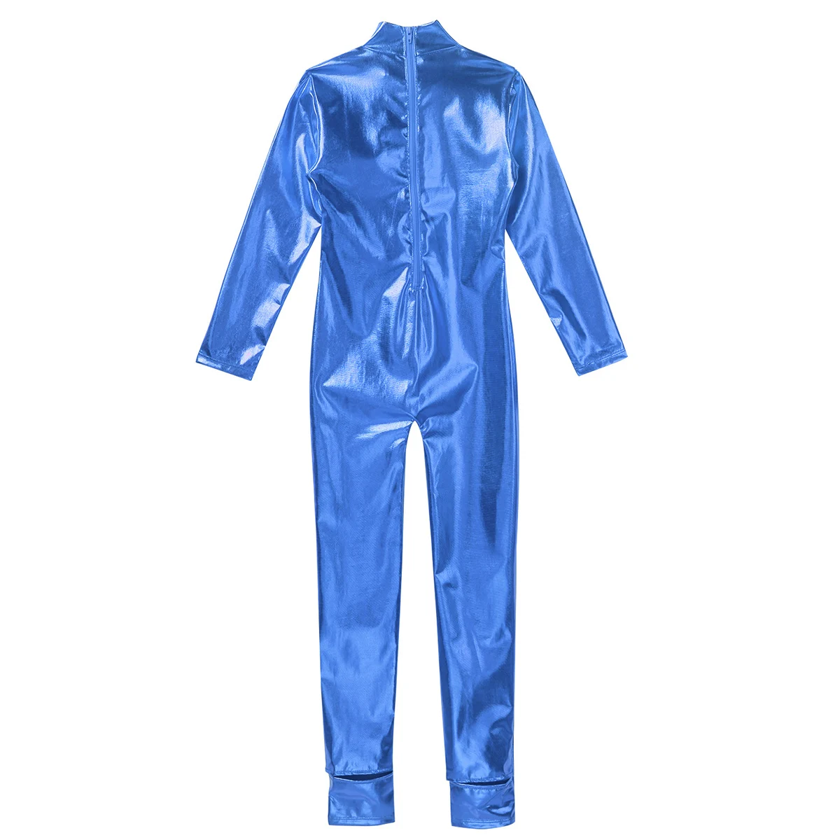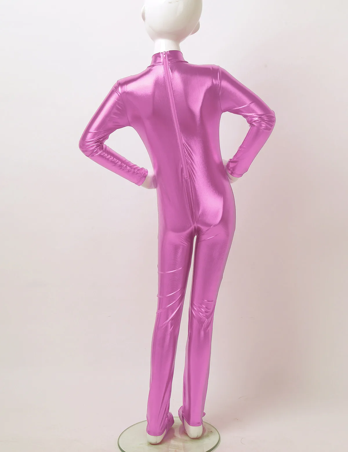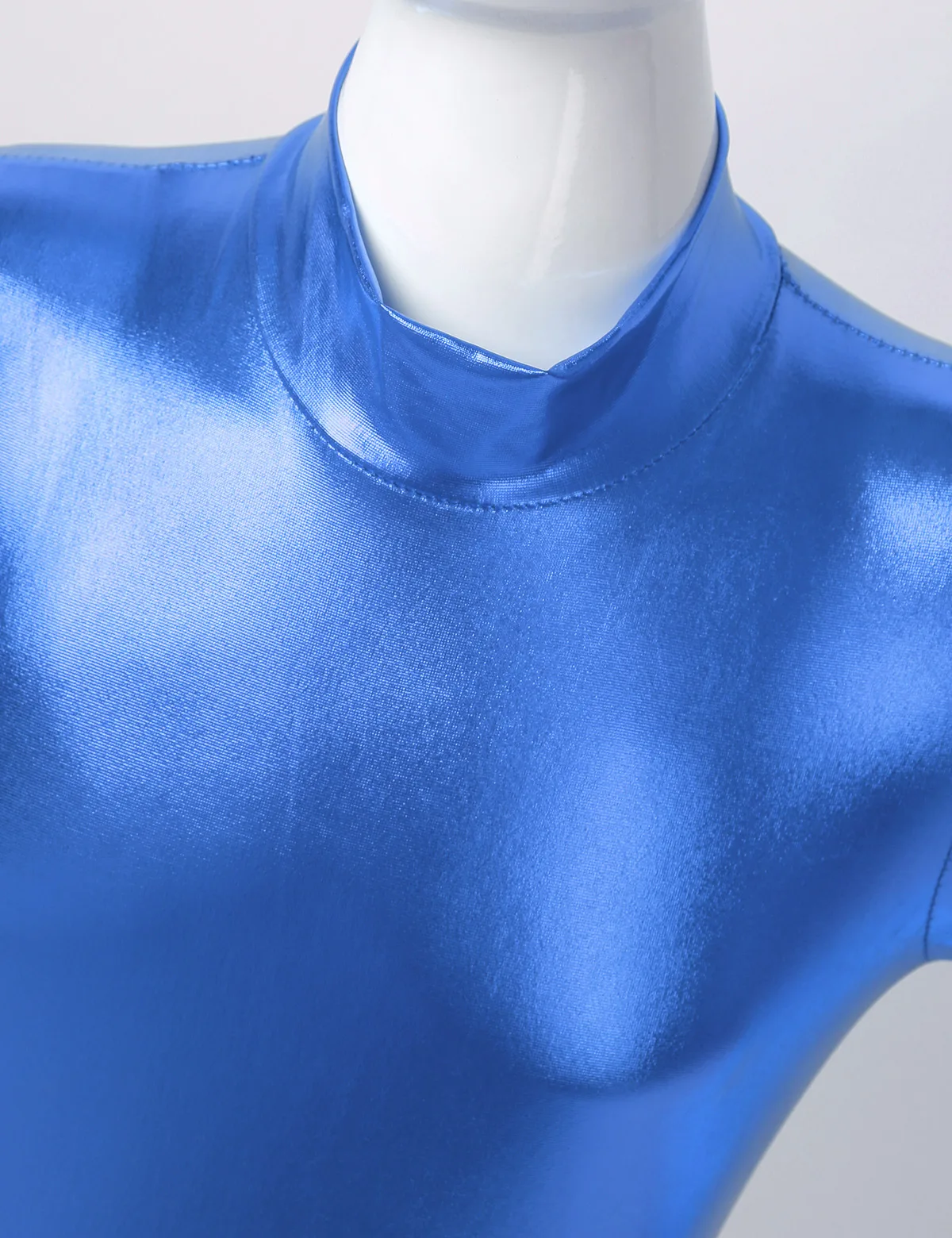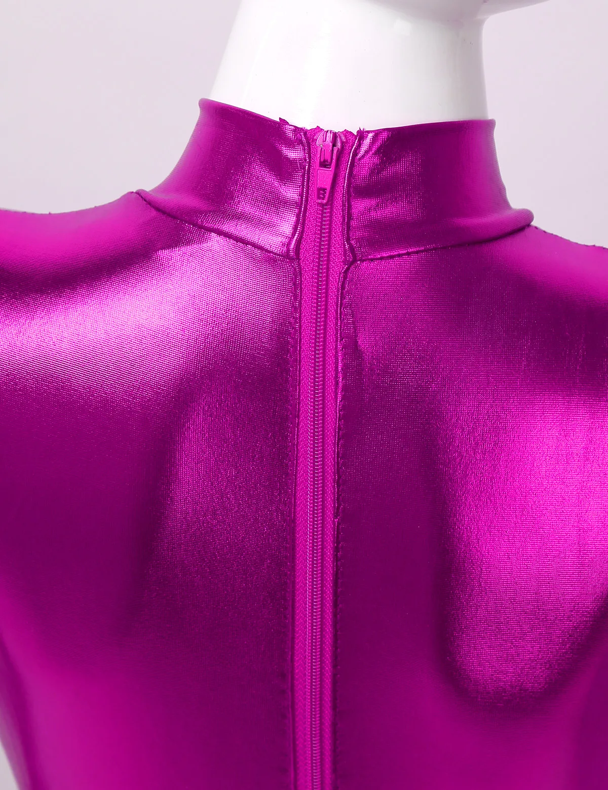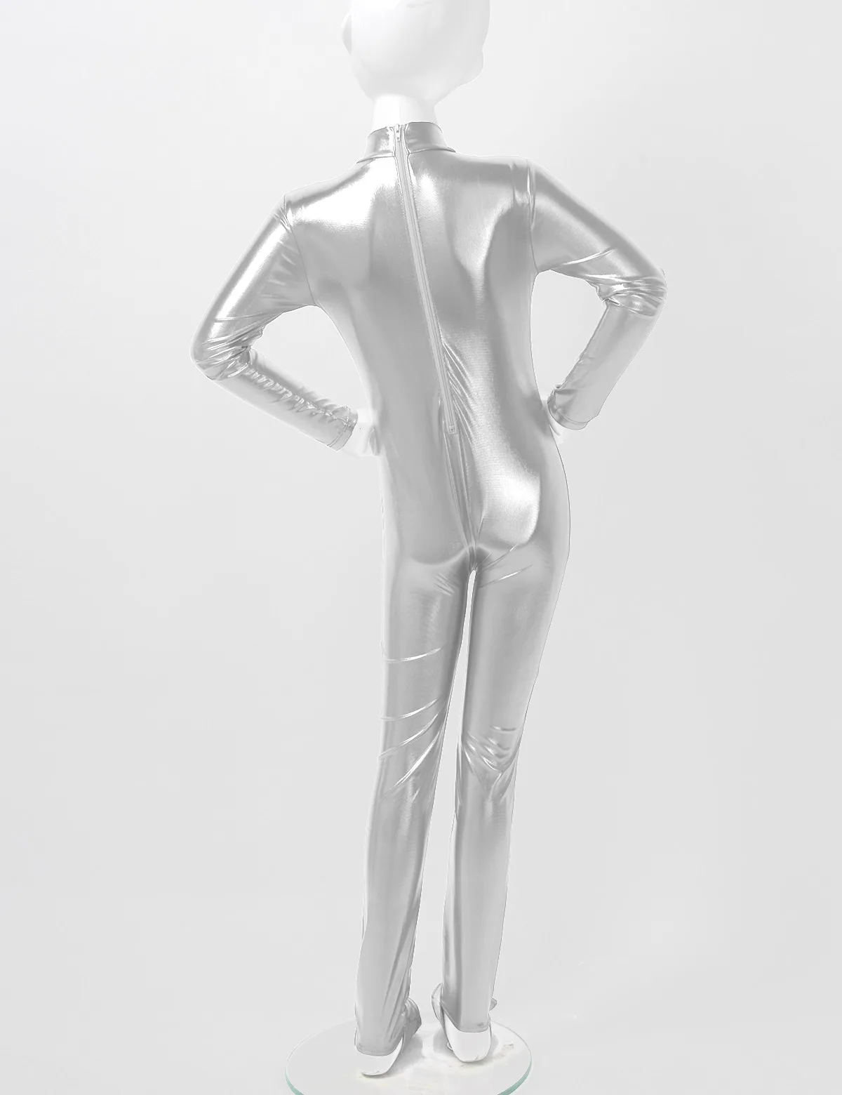 Длинные рукава, ложная горловина, застежка-молния сзади для удобства одевания. Глянцевый металлик.