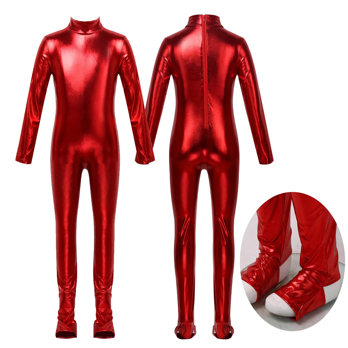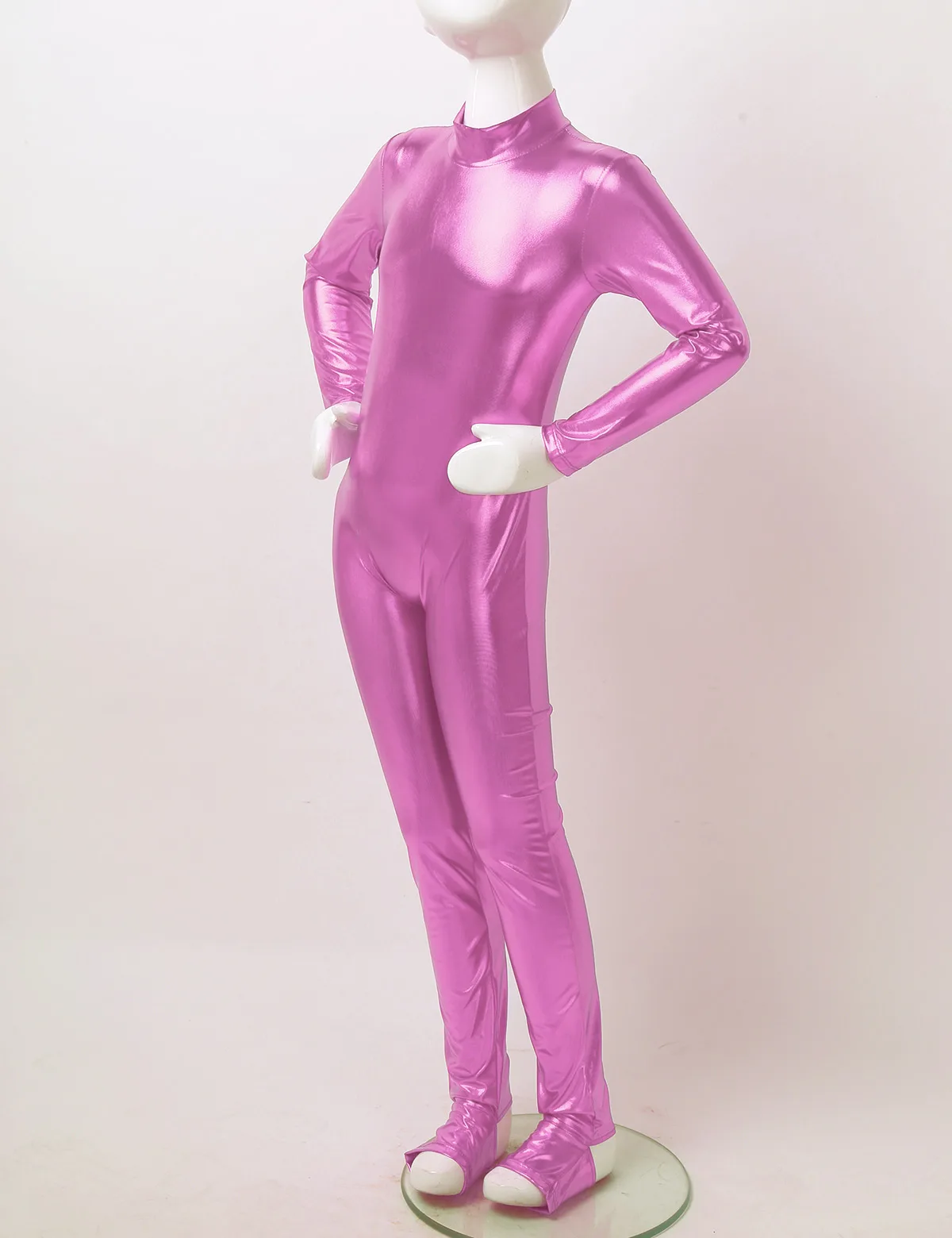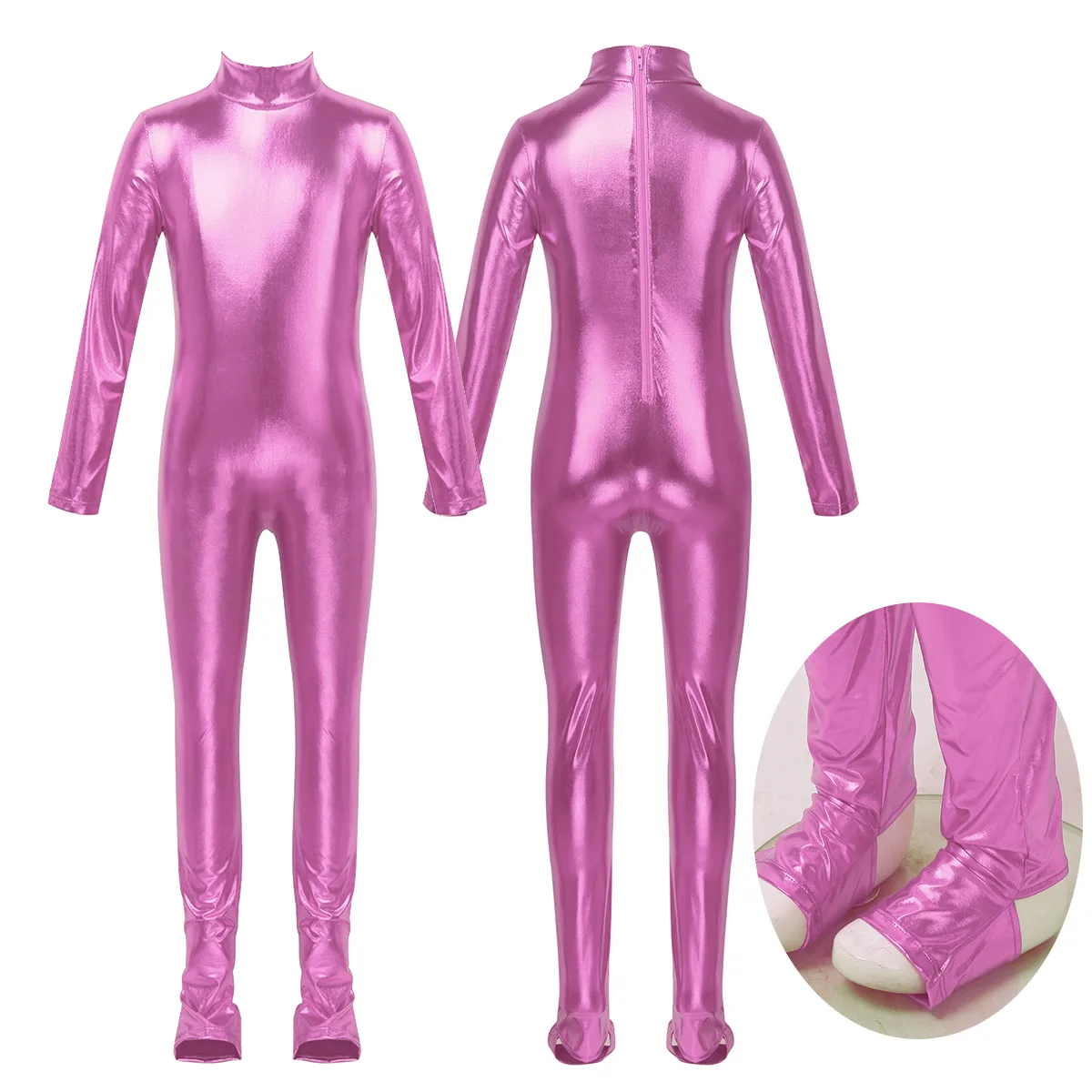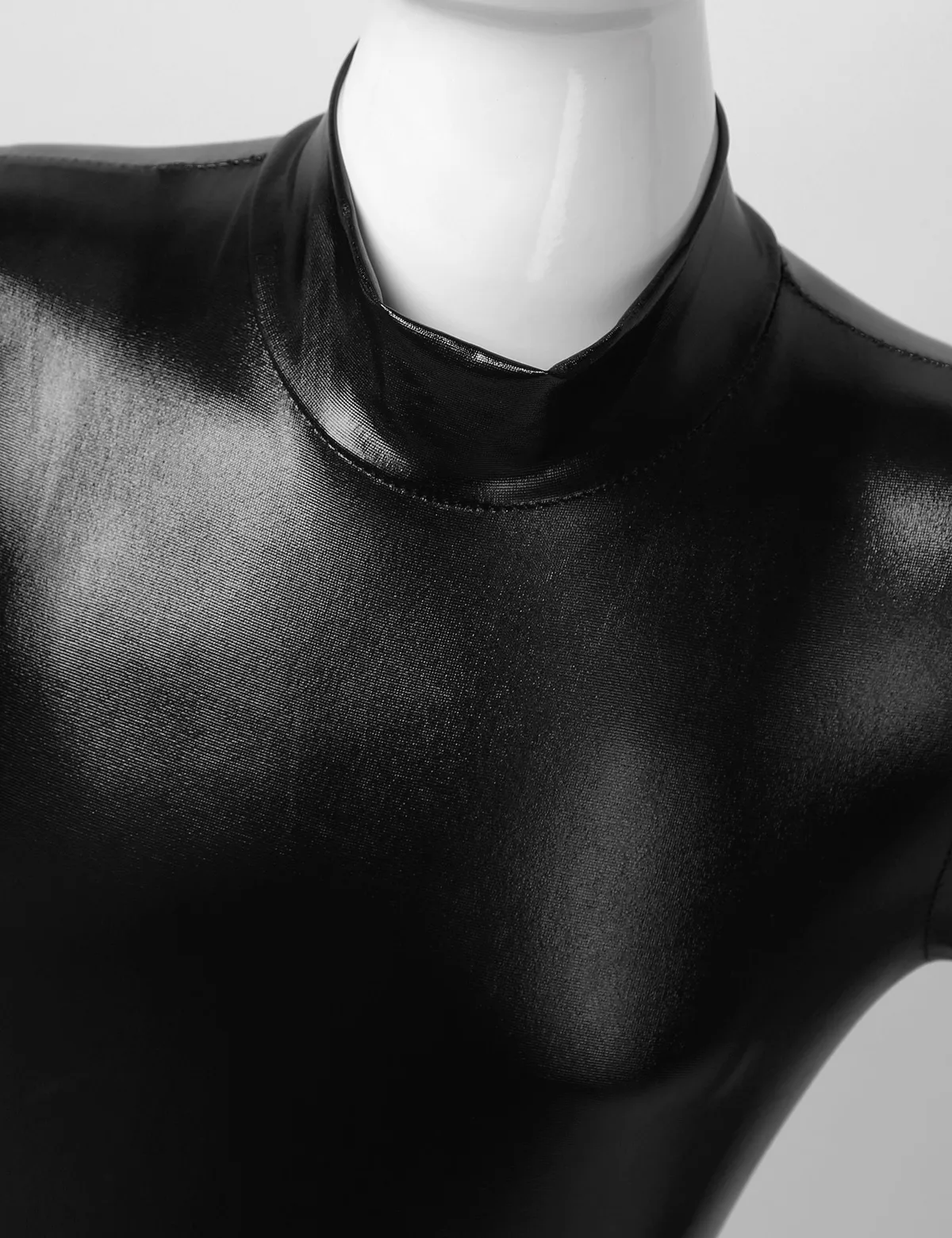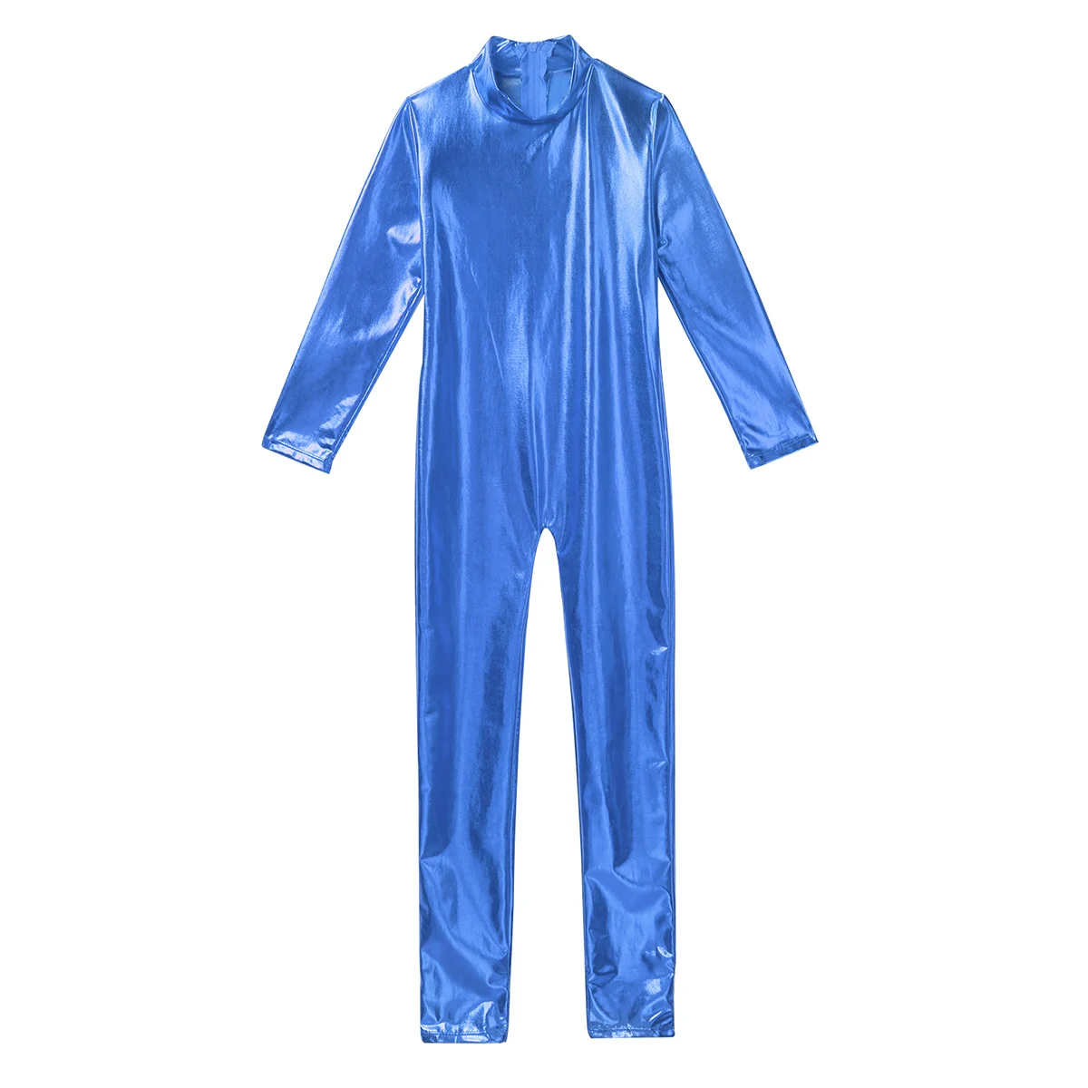Длинные рукава, ложная горловина, застежка-молния сзади для удобства одевания. Глянцевый металлик.