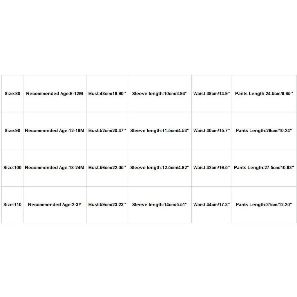 Размер Рекомендуемый возраст Бюст Длина рукава Талия Длина брюк 80 6-12 м 48 см/18,90'' 10 см/3,94 дюйма 38 см/14,9" 24,5 см/9,65'' 90 12-18 м 52 см/20,47'' 11,5 см/4,53'' 40 см/15,7" 26 см/10,24'' 100 18-24 м 56 см/22,05'' 12,5 см/4,92'' 42 см/16,5" 27,5 см/10,83'' 110 От 2 до 3 лет 59 см/23,23'' 14 см/5,51'' 44 см/17,3 дюйма 31 см/12,20''
