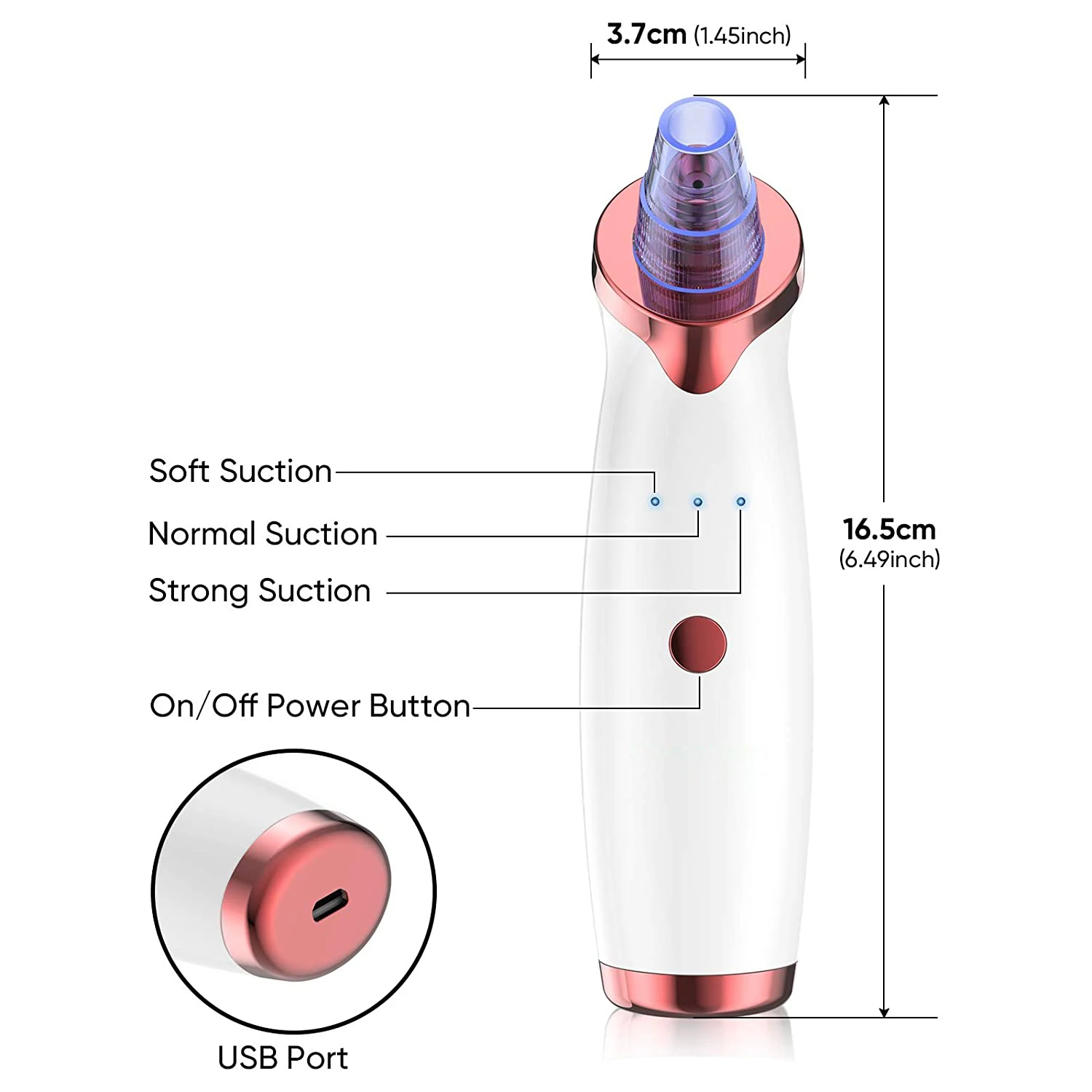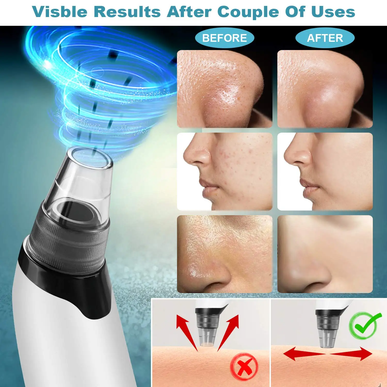 ✔5 сменных всасывающей головкой-5 сменных зондов можно использовать для решения различных проблем с кожей, таких как очистка черных точек, удаление грязи, уменьшение омертвевшей кожи и тонких линий. В соответствии с вашими потребностями, он также может использоваться для массажа кожи, сделать v-образную форму лица и повысить эластичность кожи.
