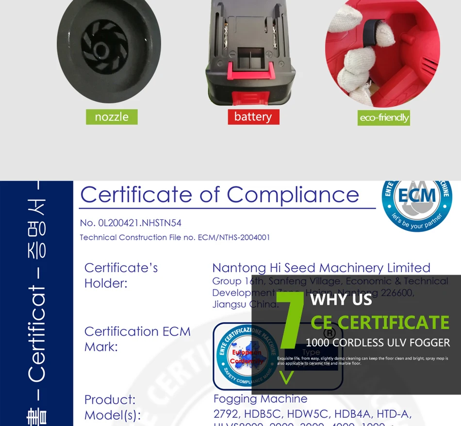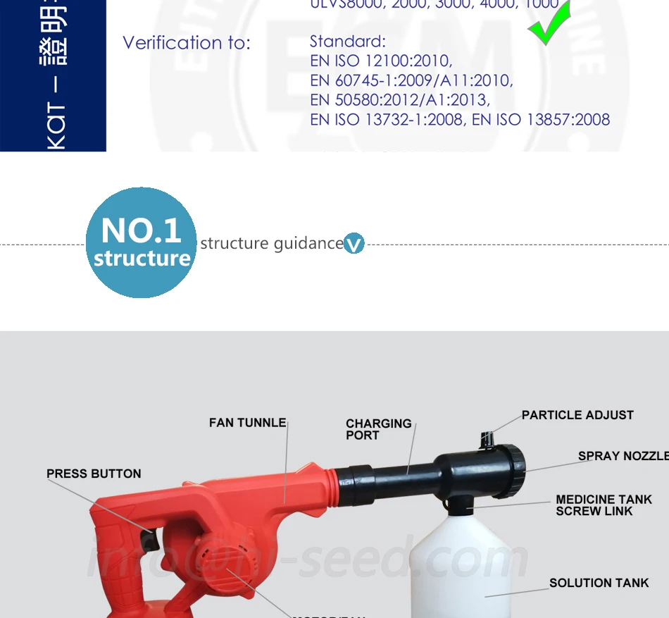 Модель 1000 Производитель hiseed Сертификат CE Медицинский ящик емкость 2.3L Объем распыления 0-400 мл/мин Размер капель 10-30 мкм (регулируется) Диапазон статического ветра 1-4 метра Время работы в течение 1 часа Номинальное напряжение 220 В мощность: 600 Вт Вес брутто 1,96 кг (включая батарею) Размер машины 310cmX55cmX16cm Партии груза на полный контейнер 20 футовый контейнер 1025 Партии груза на полный контейнер 40hq 2492