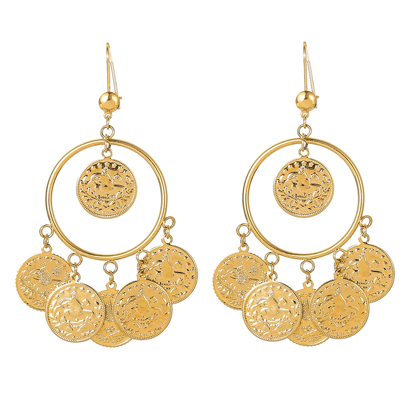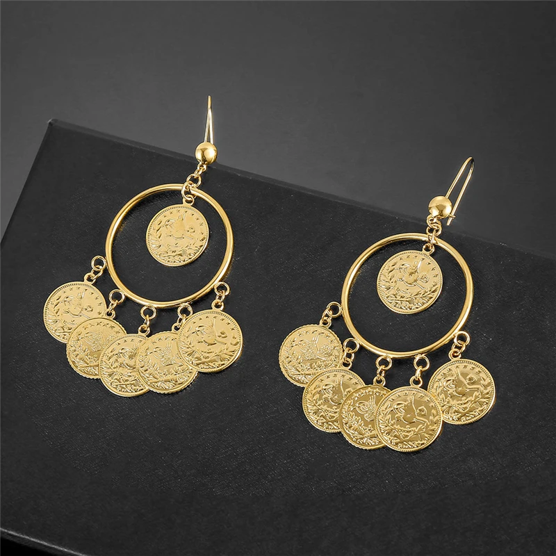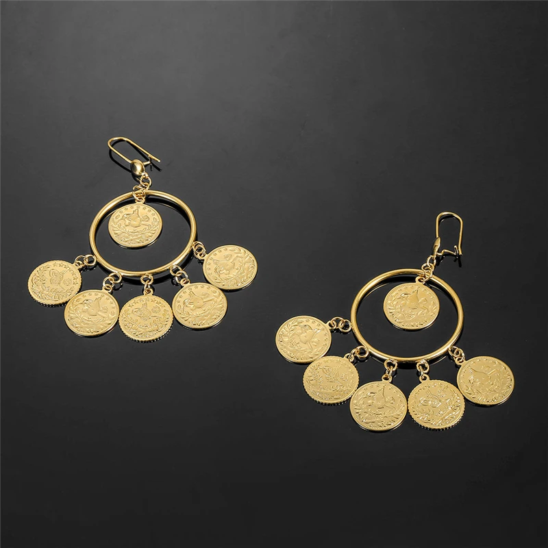 Дубай металла Монета золотого цвета серьги для женщин девушки ювелирные изделия из Нигерии подарки с кисточкой на Ближнем Востоке африканские кисточкой невесты ювелирные изделия подарок