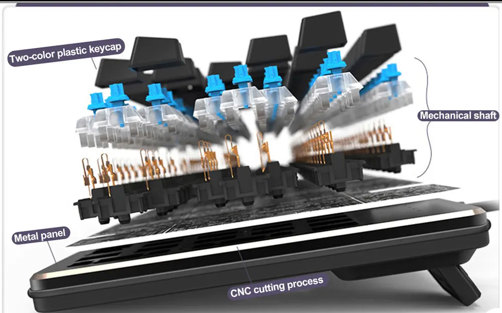 1. Ручка двойного режима, дизайн режима освещения по умолчанию, например «режим световых эффектов» и «мультимедийный режим» 2. Режим работы: Нажмите и удерживайте в течение 3 секунд, чтобы переключить мультимедийный режим, ручка светильник ключена; Режим светового эффекта, ручка засветильник рается Мультимедийный режим 1. В мультимедийном режиме (ручка выключена) нажмите кнопку, чтобы отключить функцию 2. Поверните ручку вверх, чтобы уменьшить громкость/поверните ручку вниз, чтобы увеличить громкость 3. Последняя песня M1 M2 воспроизведение/пауза M3 следующая песня Светильник вого эффекта 1. В режиме светового эффекта (светильник вой индикатор поворота s up) . Нажмите кнопку, чтобы переключить режим светильник вого эффекта и сохранить до 19 световых эффектов. 2. Поверните ручку вниз, чтобы приглушить ярсветильник/поверните ручку вниз, чтобы увеличить яркость светильник Обычный часто используемый режим освещения Светильник вой режим 1 светильник вой режим 2 светильник вой режим 3 Кнопка M1/M2/M3 установлена на освещение игровой зоны. Режим освесветильник M1 1, кнопка светильник по умолчанию WSADCQETBMVFZ 12345, Tab Shift Ctrl Alt Режим освесветильник M2 2, кнопка освесветильник по умолчанию QWERDFBASMCGYH 123456 Esc Space Tab Режим освесветильник M3 3, кнопка освесветильник по умолчанию WASDREQ 1234 Shift Ctrl запасная вкладка Enter Esc Home End FageUp вставка Delete F1 Кроме того, вы можете сделать свои собственные светильники в соответствии с вашими предпочтениями. После нажатия кнопки M в течение 3 секунд индикатор регулятора мигнет для вспышки клавиатуры, а затем нажмите кнопку M для подтверждения. Настройка программирования макросов с полной клавишей 360-клавишное макропрограммирование можно настроить, игра намного веселее и производительнее. Методы программирования поставляются с инструкциями. Восстановление заводских настроек FN + ESC 1 ~ 2 секунды Введение переключателя: Синие переключатели: Тип работы: смысл абзаца, нажмите Давление запуска: 58,9 ± 14,7 г Ход запуска: плюс мм Рабочий ход: 4 мм Синий переключатель представляет механическую ось оси вала, независимо от чувства ударного звука абзаца, сильное механическое чувство-это Тип корпуса вала, звук, чистый голос, сильное чувство ритма при наборе текста, наборе текста и офисных развлечениях также отлично подходит для игр. Черные переключатели: Тип работы: Линейный Давление запуска: 78,9 ± 14,7 г Ход запуска: плюс мм Рабочий ход: 4 мм Черный переключатель-подходящая ось для игр. Черная вертикальная ось. Нет смысла абзаца, маленький голос и ось Цин в резком контрасте. Быстрый запуск, мощный возврат, выбор игрока. Подсветка 1. Стильный дизайн с плавающей крышкой; 2. Оригинальная передовая технология литья под давлением Gemini, символы клавиш никогда не носятся; 3. Механический переключатель в 500 миллионов раз гарантирует срок службы; 4. Профессиональный игровой чип; 5. Дизайн ручки с двумя режимами по умолчанию, нажмите кнопку, чтобы переключить светильник; 6. Кабель с магнитным кольцом против помех обеспечивает более стабильную передачу данных; Параметры . Способ передачи: Проводной USB . Количество кнопок: 108 . Ключевой маршрут: 4,0 мм . Ключевая сила: 60 +-10 г . Срок службы ключа: 50 миллионов . Номинальный ток и напряжение: 5 В постоянного тока/мА . Требования к изделию: Vista/Windows 7,8,10/Mac Установка: подключи и работай Проводная Механическая клавиатура поддерживает plug and play.