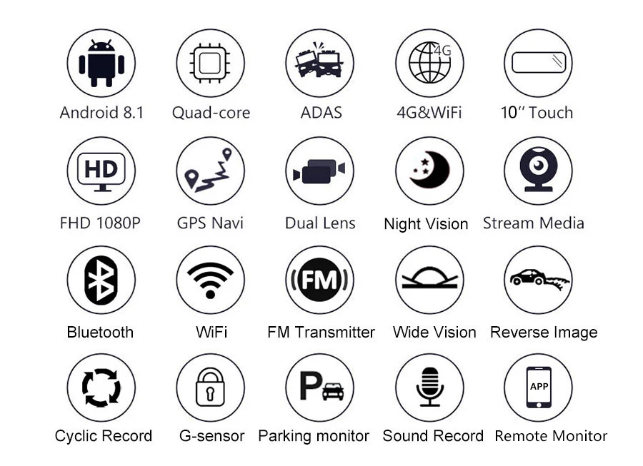> Android 8,1 гладкая операционная система SL8541E quad core 1,4 ГГц высокопроизводительный процессор включает Android 8,1 интеллектуальных систем, собран в Оперативная память 2 ГБ + Встроенная память 16 Гб. > 10 дюймов полный Экран На дисплее используются новые технологии и технологии, чтобы точно следовать изгибам дизайна, вплоть до элегантных закругленных углов, для того, чтобы обеспечить 100% просмотр изображения будет отображаться в этом 10 дюймов Полностью зеркальная поверхность экрана. > Тройное широкое зеркало заднего вида по технологии потокового видео. Он оснащен этой передовой технологией потокового мультимедиа с задней камерой HD (1920x1080p), что делает вождение заднего вида более широким, это тройной широкий вид, если сравнить с традиционным зеркалом. > GPS навигации Sygic или Navitel или google Maps GPS навигация имеет поле поиска, что позволяет легко найти адреса. Индикатор ограничения скорости-устройство отображает ограничения скорости для большинства основных дорог. > 4G модуль для sim-карты + WIFI модуль маршрутизатора 4G sim-карты и встроенный wifi, независимо от того, где вы едете, вы будете наслаждаться весельем от интернет-серфинга, сделать его возможным для онлайн-навигации/музыки/кино и т. Д. Примечания: перед размещением заказа, пожалуйста, проверьте, находится ли ваша локальная сеть sim-карт ниже полос или нет: 2G / GSM:900(B8)/1800(B3); 3G /WCDMA:2100(B1)/900(B8); 4G/LTE:FDD,2100(B1)/1800(B3) В противном случае Автомобильный видеорегистратор не будет идентифицировать вашу sim-карту. > Удаленный монитор в приложении Car Assist Просмотрите обзор зеркального видеорегистратора с помощью приложения для смартфона «Car Keeper». Продолжайте заниматься серфингом в Интернете и удаленно Отслеживайте путь вождения автомобиля. > ADAS Plus делает вождение более безопасным Усовершенствованные системы сигнализации вождения (LDWS/ FCWS/FVMA) , это полезные системы сигнализации, чтобы сохранить безопасность вашего вождения. > Bluetooth Hands-free После сопряжения bluetooth между видеорегистратором и смартфоном вы можете совершать и принимать звонки непосредственно с самого зеркального видеорегистратора со встроенным микрофоном и динамиком. > Fm-передачи Нравится ли вам слушать музыку во время вождения? Благодаря функции fm-передачи, вы можете легко синхронизировать зеркальную dvr музыку с вашим автомобильным аудио.
