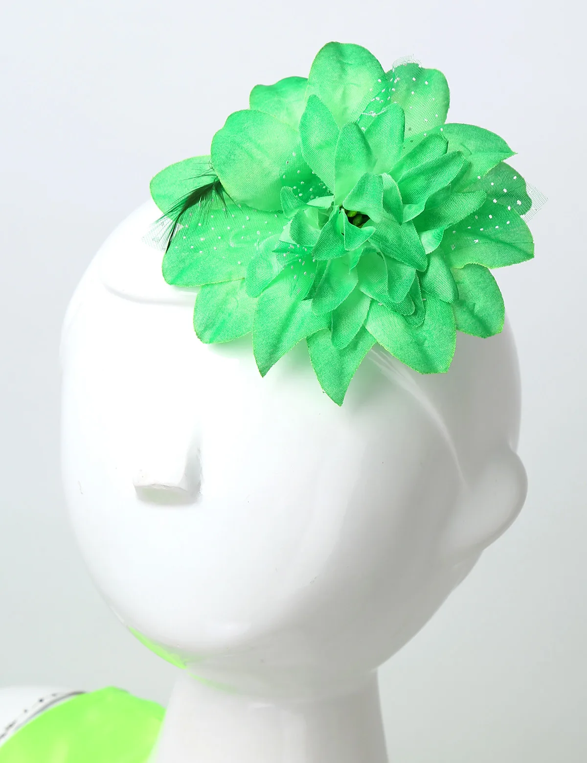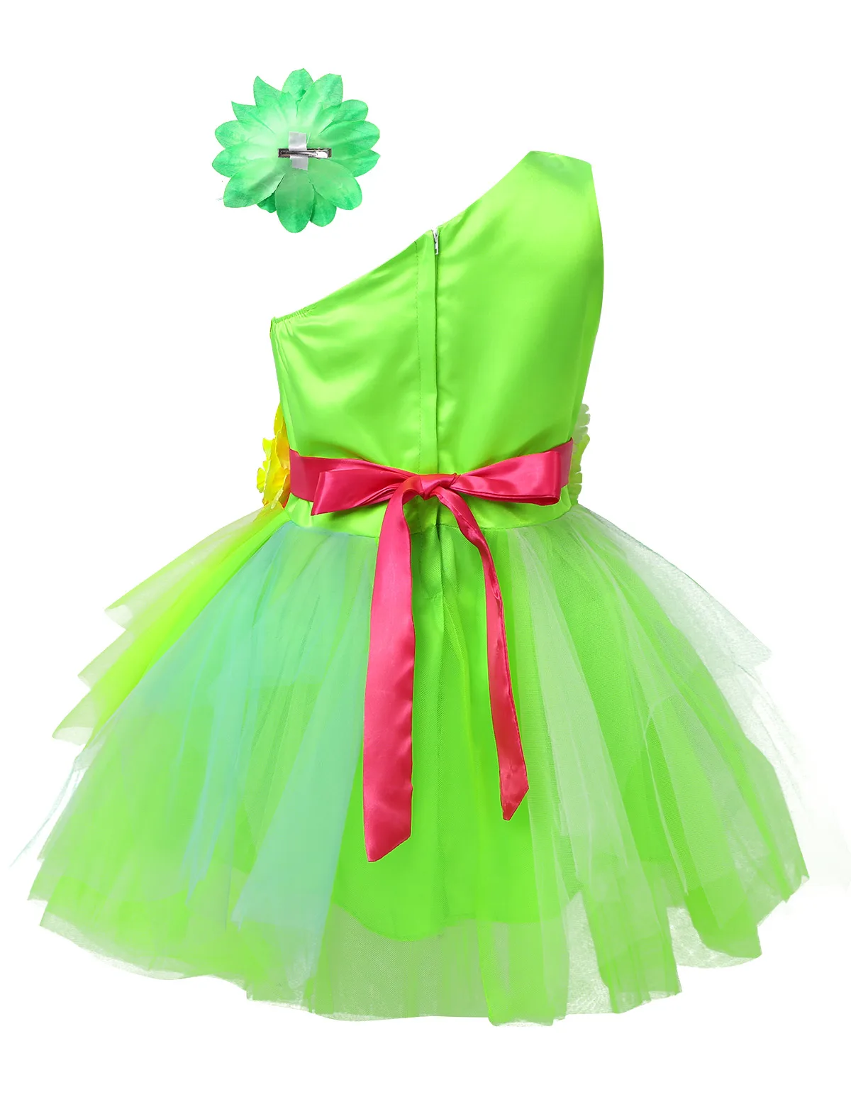 Waist is decorated with 3D flowers. 5 layer dress, top 3 mesh layers, 1 green satin layer, 1 lining. Comes with matching hair clip. Beautiful dancewear for your girl.