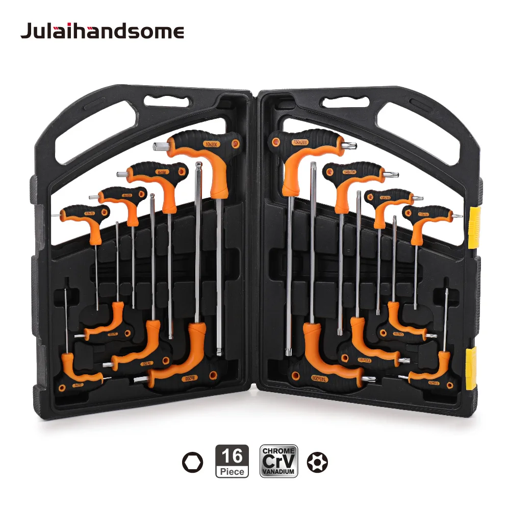 Изготовлен из хромированной стали vandium для коррозионной стойкости и долговечности. Ergnomical t-ручка с жестким резиновым захватом. Содержит основные размеры шестигранных ключей и набор из 16 штук входит в свой собственный чехол для инструментов. Метрический Размер: 2 мм 2,5 мм 3 мм 4 мм 5 мм 6 мм 8 мм 10 мм Размер Torx: T10 T15 T20 T25 T30 T40 T45 T50 Концы мяча обеспечивают движение на 30 градусов.