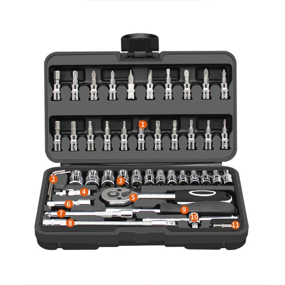 53 шт. комплект для ремонта автомобиля: Наконечник отвертки: одним словом 4, 5,5, 7 в виде буквы м; 1,2,3 крест 1,2,3 шестиугольник 3,4,5,6,7,8 мм узор T10,15,20,25,30,35 ,40 1/4 рукав: 4,4.5,5, 5,5, 6,7,8,9,10,11,12,13,14 мм 1/4 Быстрый Трещоточный ключ Укороченный стержень + длинный стержень + эластичный стержень 1/4 квадратная ручка стержня 1/4 слайдер Allen key 1, 2, 2,5 мм Универсальный шарнир Длинный рукав 6,7,8,10,11,12,13,14 мм -Этот товар хорошо изготовлен из высококачественного материала для прочного и практичного использования. С высоким качеством и точным дизайном, он обеспечит его популярию и практичность. Этот товар удовлетворит все ваши потребности. Идеальный аксессуар для вас. -Используется для затягивания или ослабления, подходит для большинства болтов, гаек, винтов в обслуживании автомобилей, механических, мотоциклов и т. д. -Трещоточный ключ может регулировать положительное и отрицательное направление, удлинитель добавляет длину и универсальное соединение дает вам лучший угол в ограниченном пространстве. -Изготовлен из закаленного обработанного хромово-ванадиевого стального сплава, обладает высокой прочностью, износостойкостью и антикоррозией. -Многофункциональный и широкий набор инструментов идеально подходит для домашних DIY проектов.