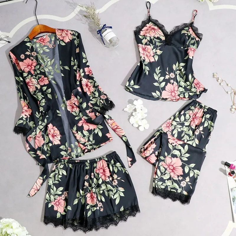 Женская атласная Свадебная Пижама Костюм Весенняя кружевная отделка пижамы пижамный комплект с цветочным принтом, одежда для сна, повседневная одежда, Домашняя одежда костюм для нижнего белья.