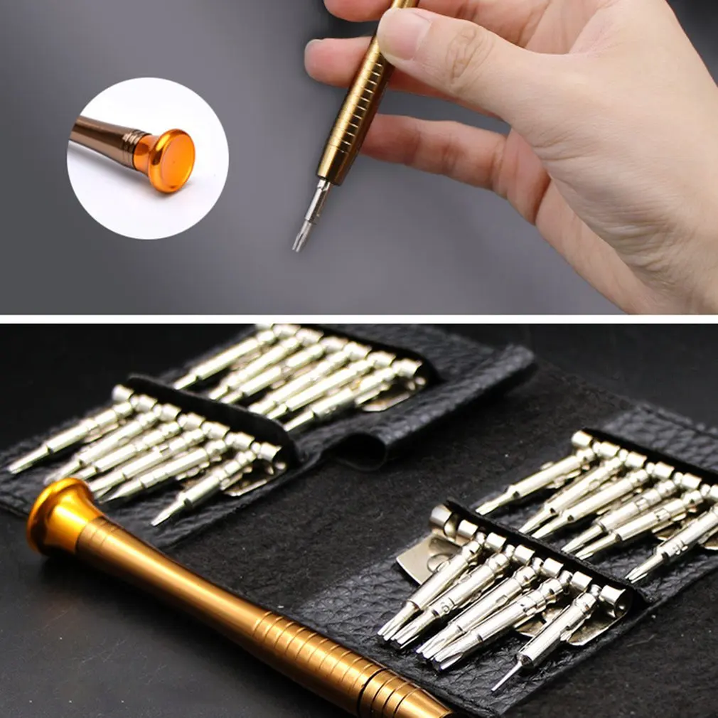 Особенности: 1. Эти отвертки разных размеров поставляются в удобном кожаном бумажнике чехол, светильник и портативный, внутренний тип головки партии фиксируется, не легко разбрызгивается. 2. Каждый бит отвертки идеально подходит к ручке и может быть легко изменен от одного к другому, поэтому Переключение с разных винтов или проектов-это ветерок. 3. Полный набор из 24 головок, может быть адаптирован для работы во многих различных областях. Подходит для большинства цифровых продуктов, различных типов компьютеров, мобильный телефон, камера, очки, часы, ключи от автомобиля, iPad, планшет, ПК ноутбук, Радиоуправляемый Дрон и т. Д. 4. Высокоточная отвертка изготовлена из высококачественной стали (хром-ванадиевая сталь) специальной термообработкой, твердость может достигать HRC52-60. 5. Ручка изготовлена из сплава материала производителя, хвост принимает точность конструкции подшипника, гибкий и простой в использовании. Описание: 1. Профессиональный и полезный инструмент. Характеристики: Материал: сталь Цвет: серебристый Тип: с магнитом, с магнитом (опционально) Количество: 25 шт. Шаг для использования: 1. Выберите партийную головку, которую вам нужно использовать, поверните на 180 градусов и вытяните 2. Отвинтите крышку ручки 3. Положите головку партии в ручку 4. Завинтите крышку ручки Посылка включает в себя: 10 x"✡"(Звездочные шестигранные отвертки) (T2/T3/T4/T5/T6/T7/T8/T9/T10/T15) 5 x "+" (крестообразные отвертки) (1,0/1,2/1,5/2,0/3,0) 4 x "-" (отвертки с плоским лезвием) (1,0/1,5/2,0/3,0) 2 x"★"(Пятиугольная отвертка) (0,8/1,2) 1 x "Y" (отвертка y-типа) (2,0) 1 x "Screwdriver" (треугольная отвертка) (2,3) 1 x "⊙" (точечная отвертка) (0,8) 1 отвертка 1 х Черная сумка