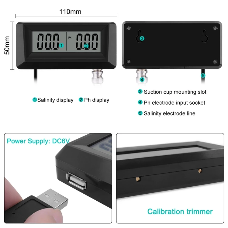 Радиус действия: PH: 0,00 до 14,00 pH Соленость: от 0 до 1995 г. 9PPT Разрешение: PH: 0,01 pH Солености: 0.1ppt Точность: PH: ± 0,1 pH Соленость: ± 2 грамма F · S Размеры: 110 мм x 51 мм x 22 мм