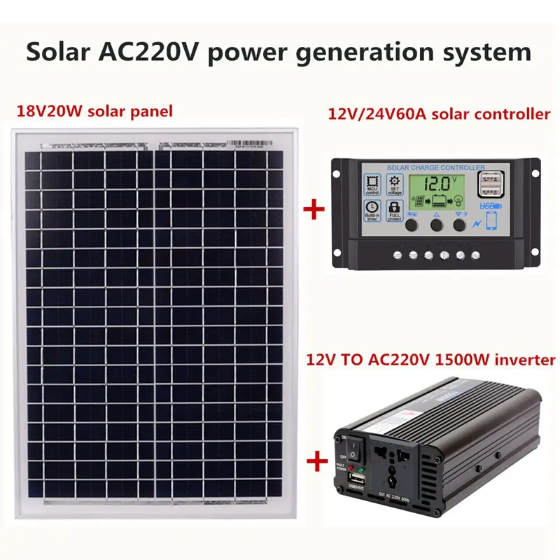 Характеристики: 18V20W солнечная панель + 12V / 24V контроллер + 1500W инвертор AC220V комплект, этот продукт подходит для наружного и домашнего AC220V солнечной энергии окружающей среды генерации энергии