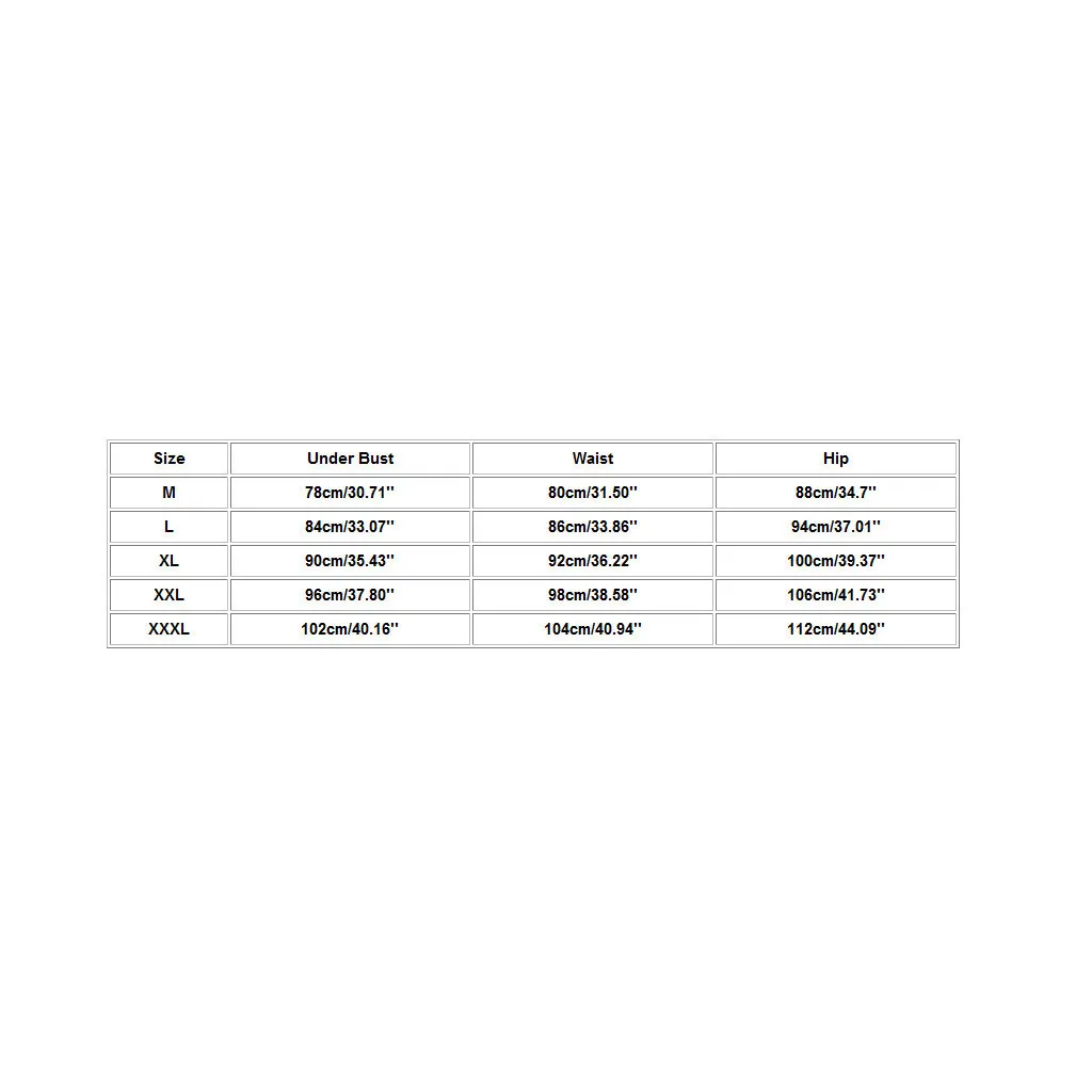 РазмерПод грудьюТалияБедраМ78 см/30,71 дюйма80 см/31,50 дюйма88 см/34,65 дюймаL84 см/33,07 дюйма86 см/33,86 дюйма94 см/37,01 дюймаXL90 см/35,43 дюйма92 см/36,22 дюйма100 см/39,37 дюймаXXL96 см/37,80 дюйма98 см/38,58 дюйма106 см/41,73 дюймаXХХL102 см/40,16 дюйма104 см/40,94 дюйма112 см/44,09 дюйма