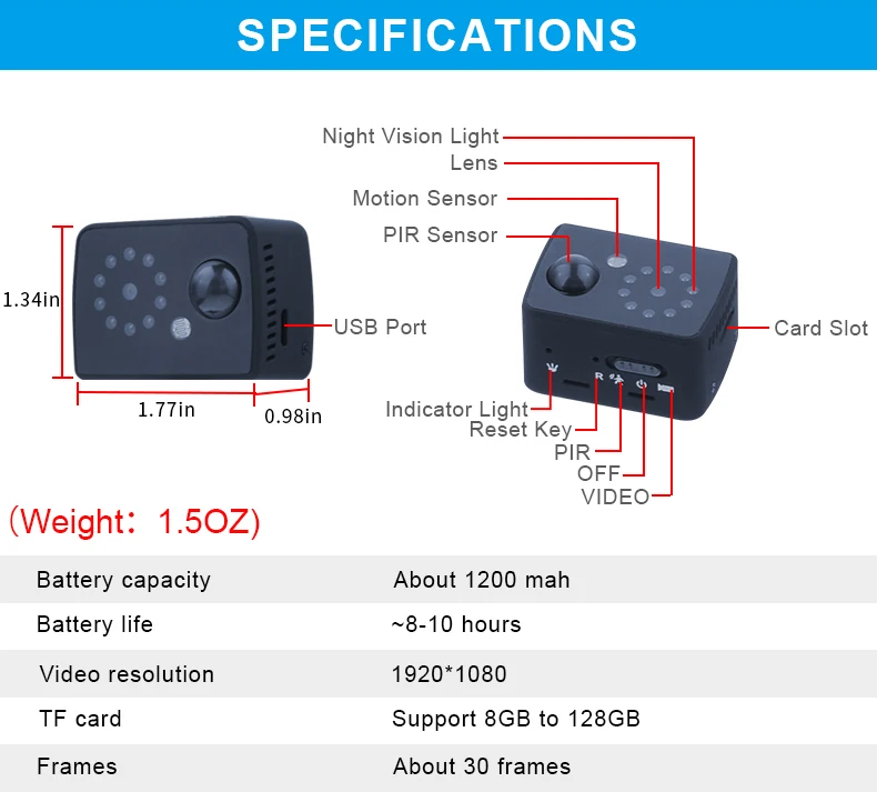 Номер модели: мини-камера PIR Технология датчика: CMOS H62 Формат видео: AVI Кодирование видео: m-jpeg Разрешение видео: 1920*1080 Частота кадров видео: 30 кадров в секунду Функция PIR: обнаружение тела в 5 м Поддержка: ночное видение Емкость аккумулятора: около 1200 мАч Время записи: около 8 ~ 10 часов Время работы в режиме ожидания: максимум 30 дней Напряжение зарядки: DC-5V 1A;DC-5V 2A Поддержка хранения: 8-128 ГБ FAT32 Скорость передачи: USB 2,0 Тип интерфейса: Micro USB