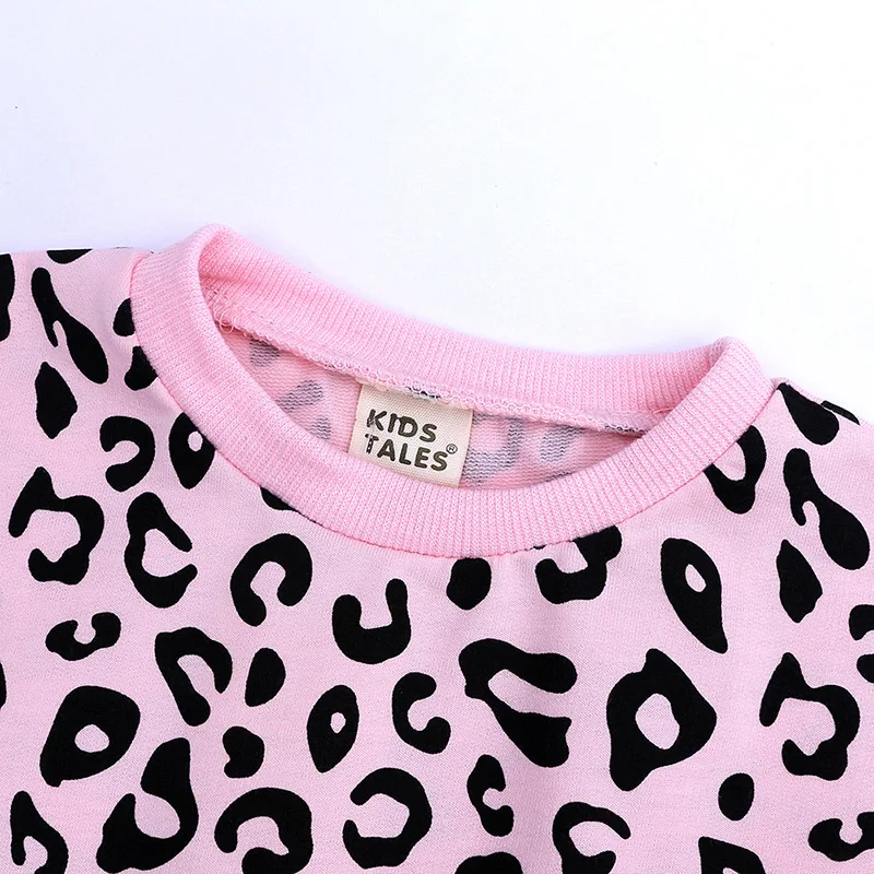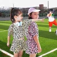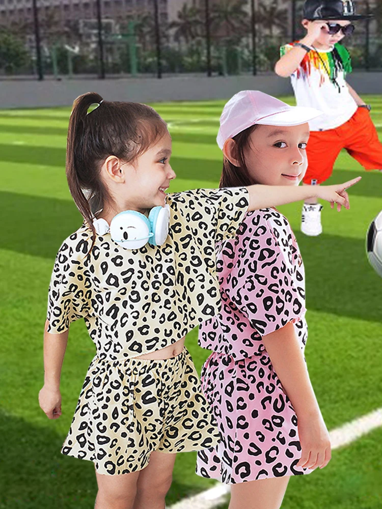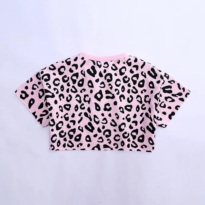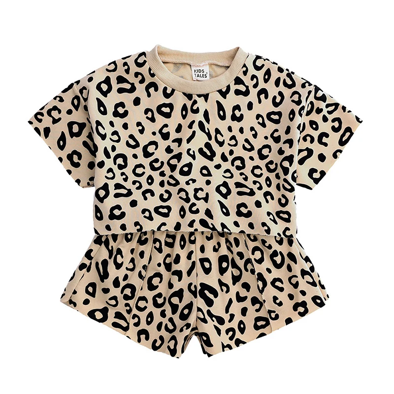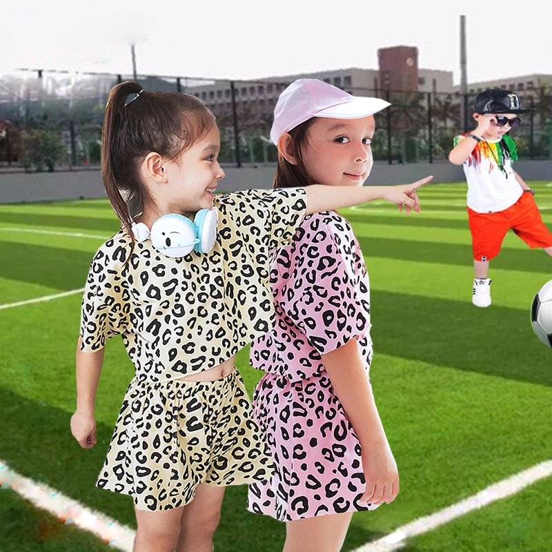 Детская одежда Одежда для девочек Корейская версия, новая футболка с леопардовым принтом + брюки средней длины комплект из двух предметов, качественная детская одежда