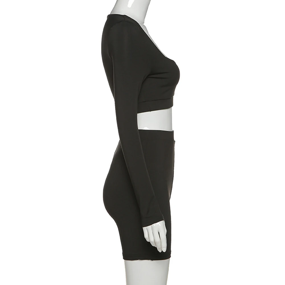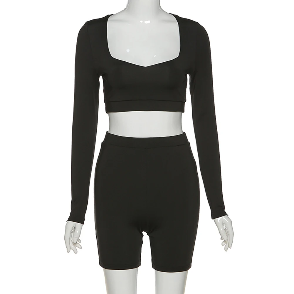 Женские летние облегающие черные модные повседневные наряды с длинным рукавом базовые Топы Короткие штаны с круглым вырезом комплекты из двух предметов