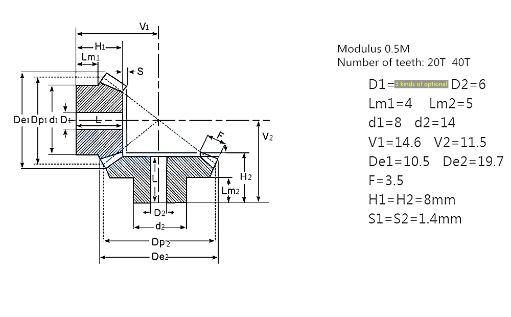 2. Фиксированная коническая шестерня 40T имеет отверстие 6 мм, коническая шестерня 20T может выбрать 1/3/3/4 мм