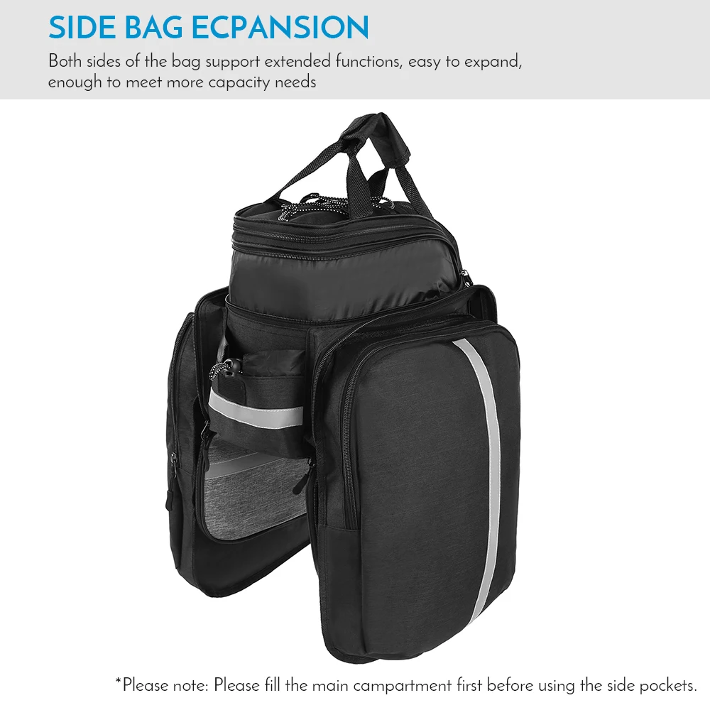 Расширение бокового кармана-велосипедная Сумка поддерживает расширенные функции с обеих сторон для удовлетворения большего объема. Если не нужно, закройте молнию. В верхней части велосипедного багажника находится Сетчатая Сумка с термоусадочным ремешком, который фиксирует Аксессуары для велосипеда, такие как мини-насос.