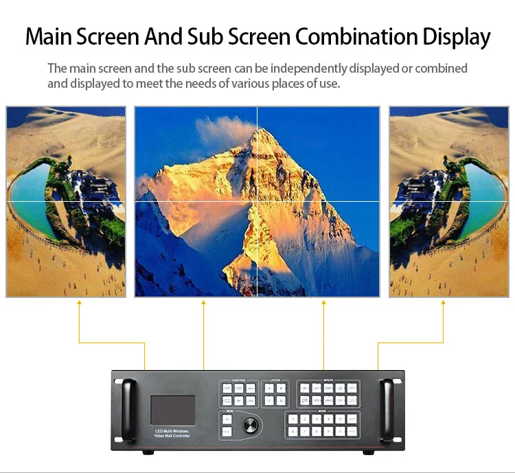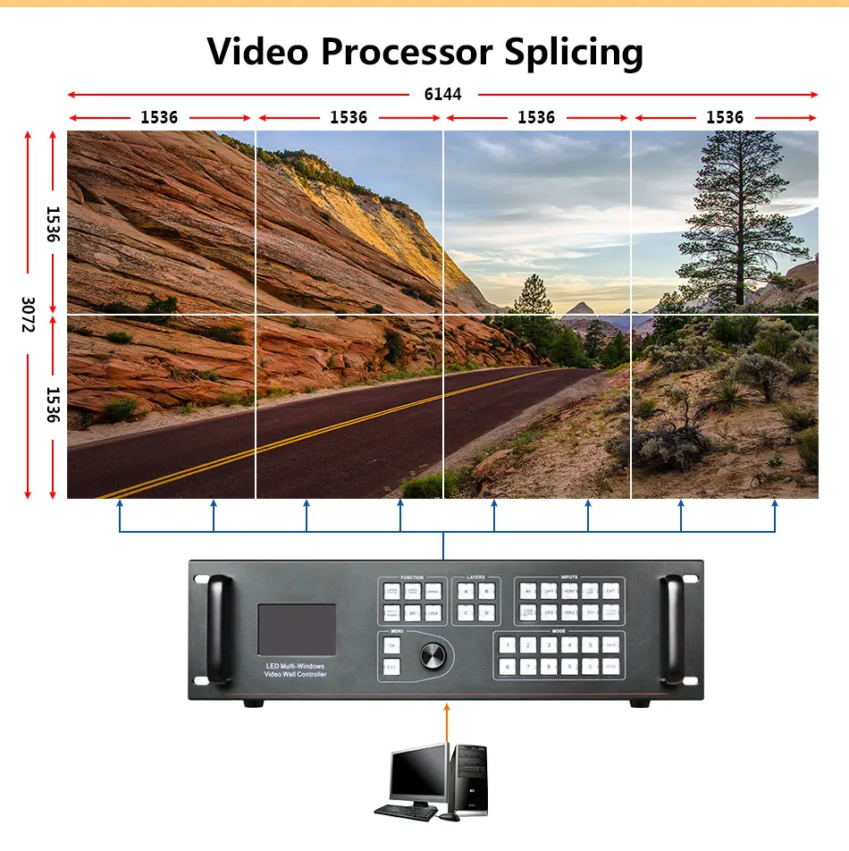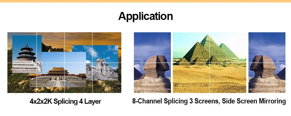 Это high-end 4K x 2K @ 60 Гц, мощный 8-канальный мульти-Графический мульти-вход с видеопроцессор, он может одновременно вводить 4K x 2K видео, и любое 4K x 2K видео может быть произвольно масштабировано и роуминг. Он может отвечать ультра-высоким требованиям к дисплею.
