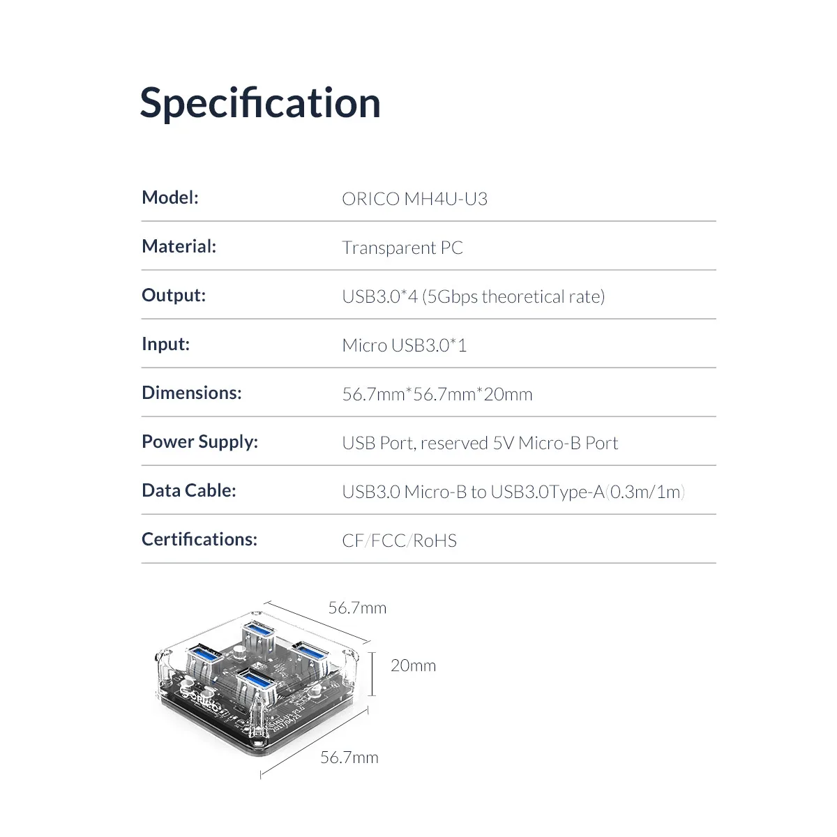 Название товара: ORICO 4 порта USB 3,0 прозрачный концентратор Материал: прозрачный Твердый чехол для компьютера Выход: USB3.0 * 4 Вход: Micro USB3.0 * 1 Размер: 56,7 мм * 56,7 мм * 20 мм Источник питания: блок питания Micro USB источник питания Преимущества: без инструментов/Горячая замена/без дисков Поддерживаемые системы: Windows/MAC/Linux Кабель для передачи данных: отдельный дизайн, 100 см/30 см Индикатор: синий светодиодный индикатор Сертификат: CE, FCC, RoHS