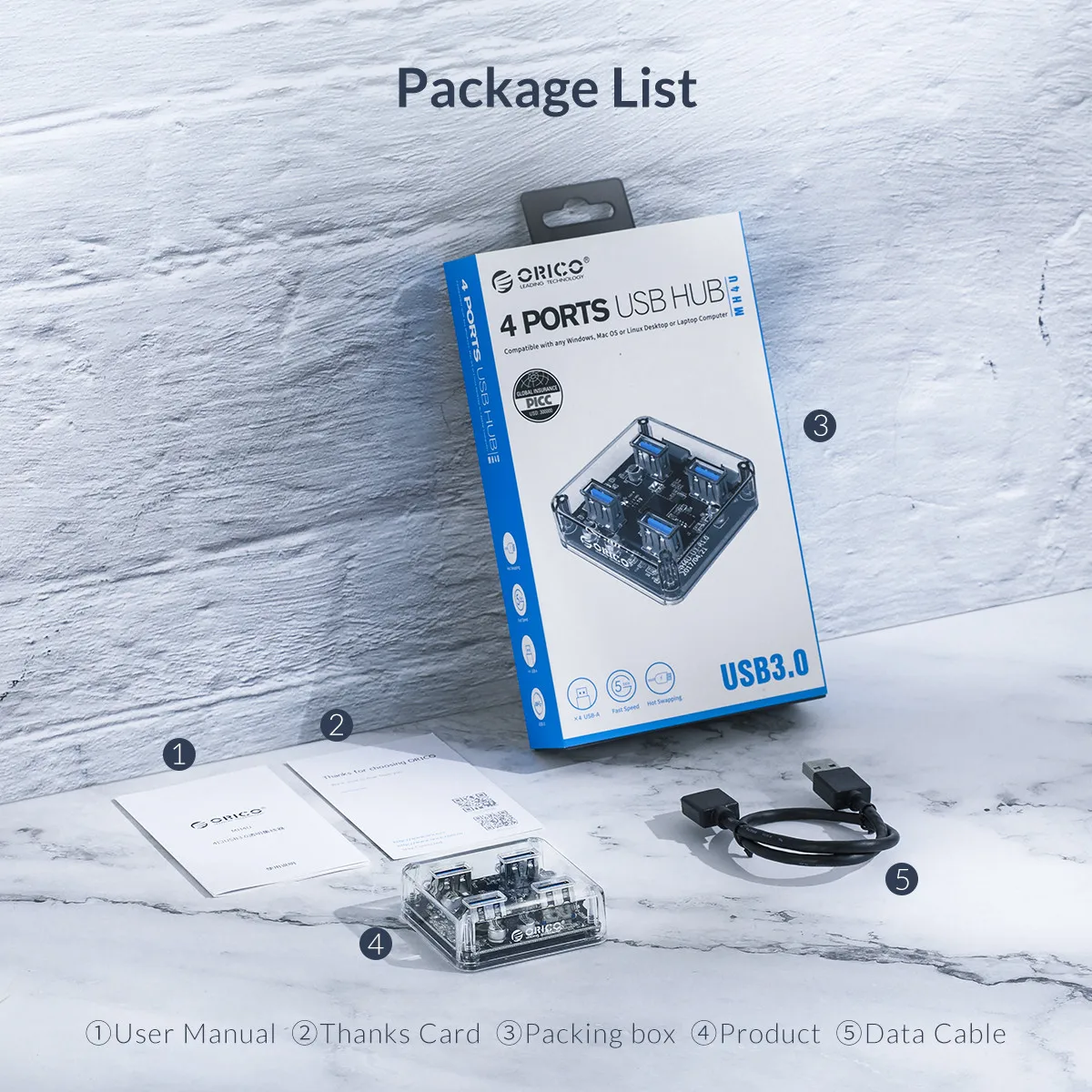 1 х ORICO 4 порта USB 3,0 прозрачный концентратор 1 х 30 см/100 см микро USB кабель Руководство пользователя (1 шт.) 1 x Услуги карты