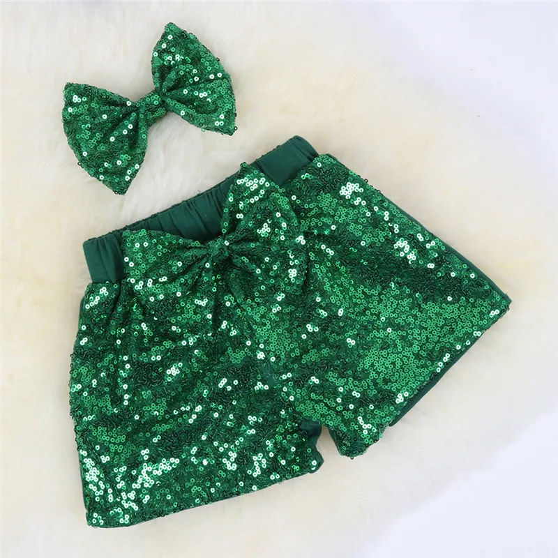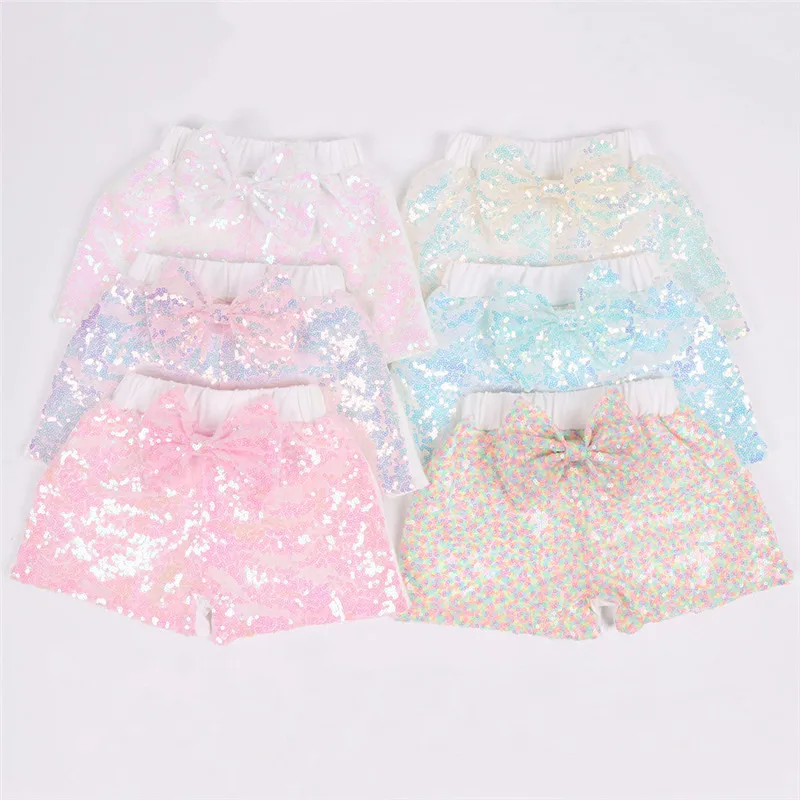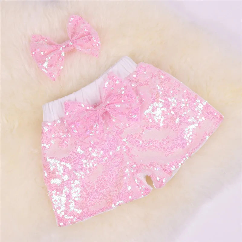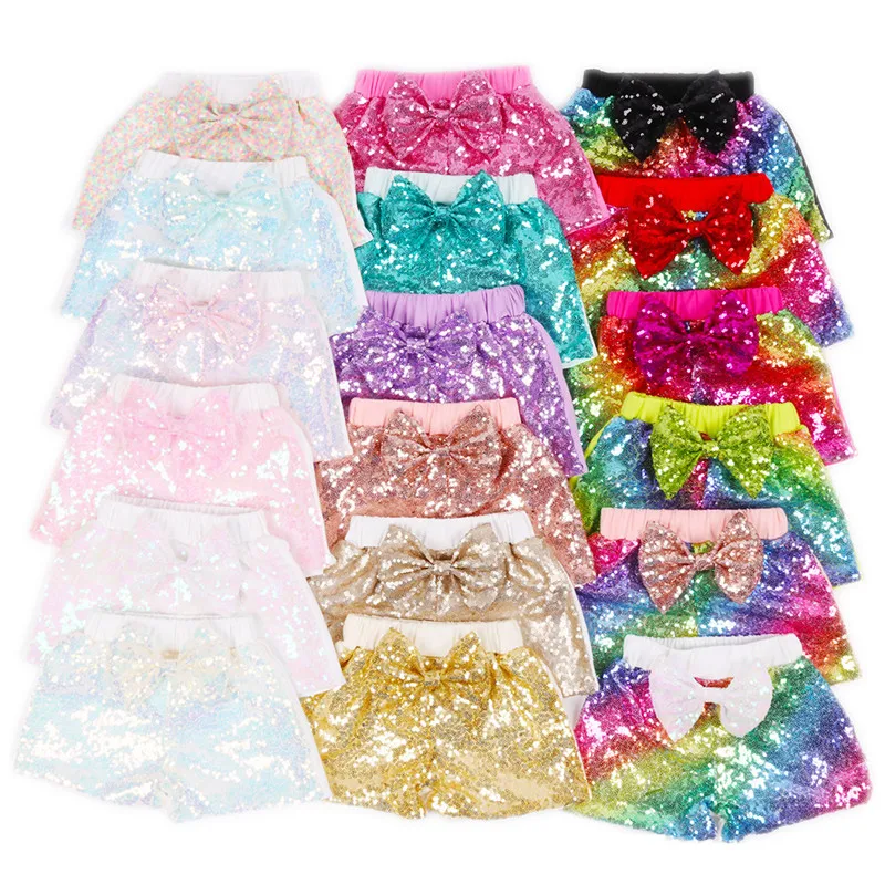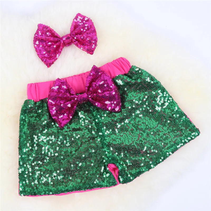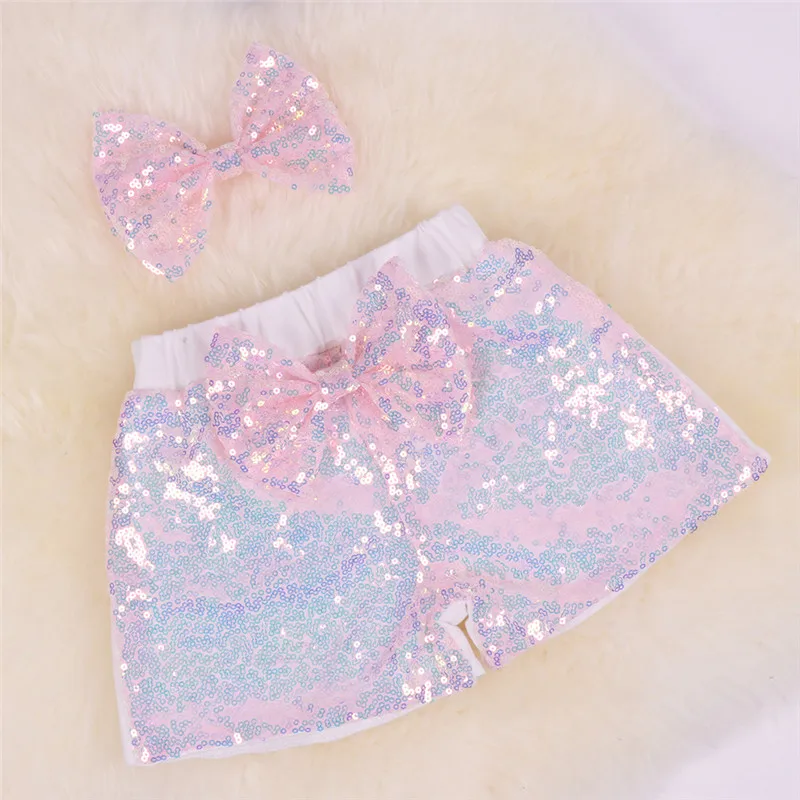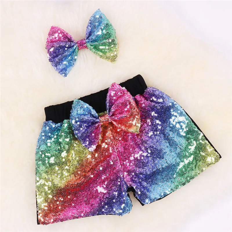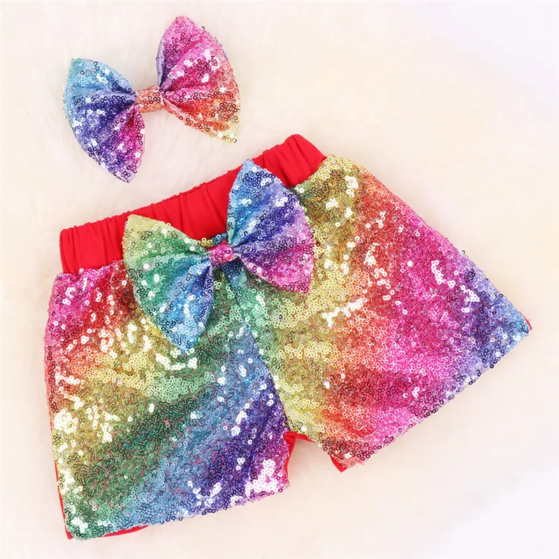 Высококачественные двухсторонние радужные шорты с пайетками повязка на голову с бантом и цветами, одежда для маленьких девочек из 2 предметов детский танцевальный костюм хлопковые шорты для девочек, От 1 до 6 лет