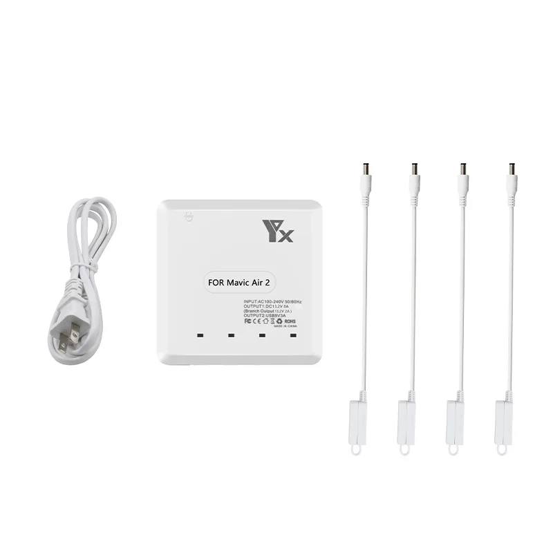 Комплект: 100-240 в перем. Тока Выход (аккумулятор): 13,2 в пост. Тока, 8 А (Выходная мощность ветки: 13,2 В 2 а) Выход 2: 5 в пост. Тока, 3 А, USB-A Время зарядки: Полная зарядка 4 батареи, около 110 минут Характеристики: быстрая зарядка 4 аккумулятора одновременно Размер зарядного устройства: 11,5*11,5*3,2 см Посылка Размер: 15,5*15,2*3,8 см Посылка включает в себя: Зарядное устройство для Mavic Air 2-1 шт. Зарядный кабель-4 шт. Шнур питания-1 шт. (Примечание: зарядное устройство, аккумулятор/пульт дистанционного управления/сотовый телефон не входит в комплект)