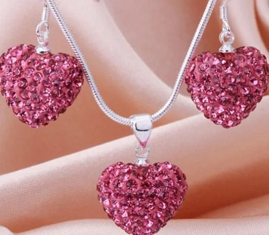 Бесплатная доставка, новое поступление, модные серьги с розовыми кристаллами в форме сердца, ожерелье с кристаллами, набор из серег, стразы, шарики, ювелирное изделие