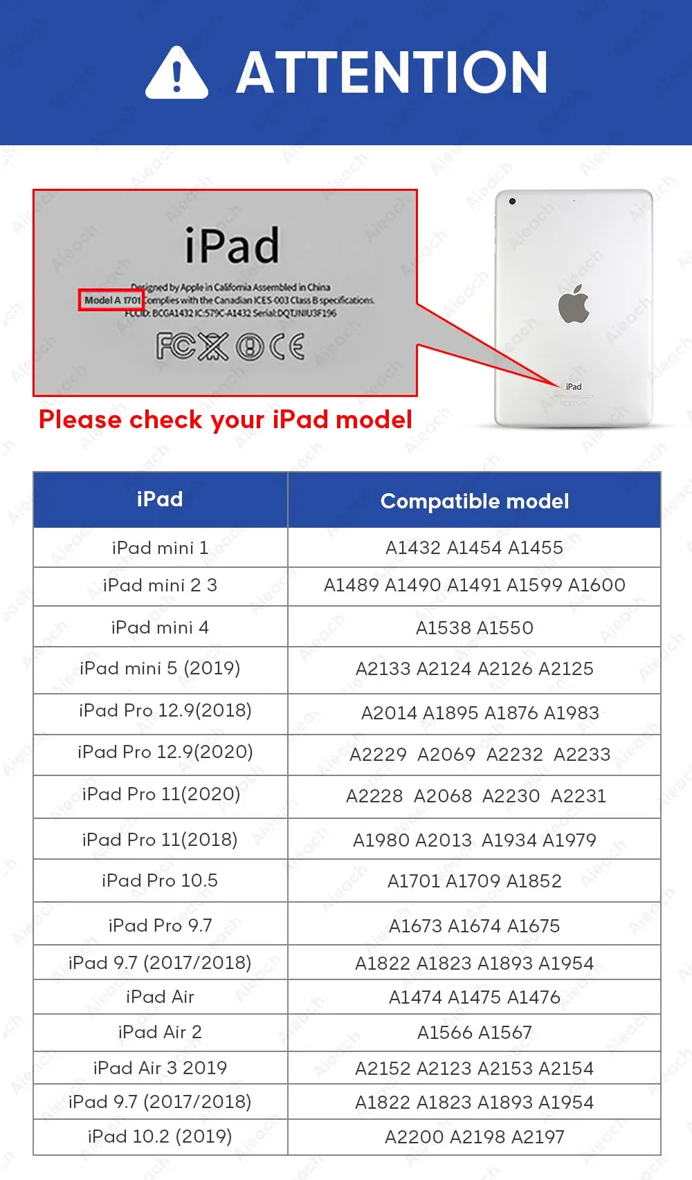 Перед покупкой, пожалуйста, проверьте правильную модель iPad в соответствии с советами на фото и выберите для покупки. Если вы не можете подтвердить, пожалуйста, свяжитесь с нами, профессиональная поддержка клиентов поможет вам. Мы не несем ответственности за любые ошибки при покупке, вызванные непроверкой модели.