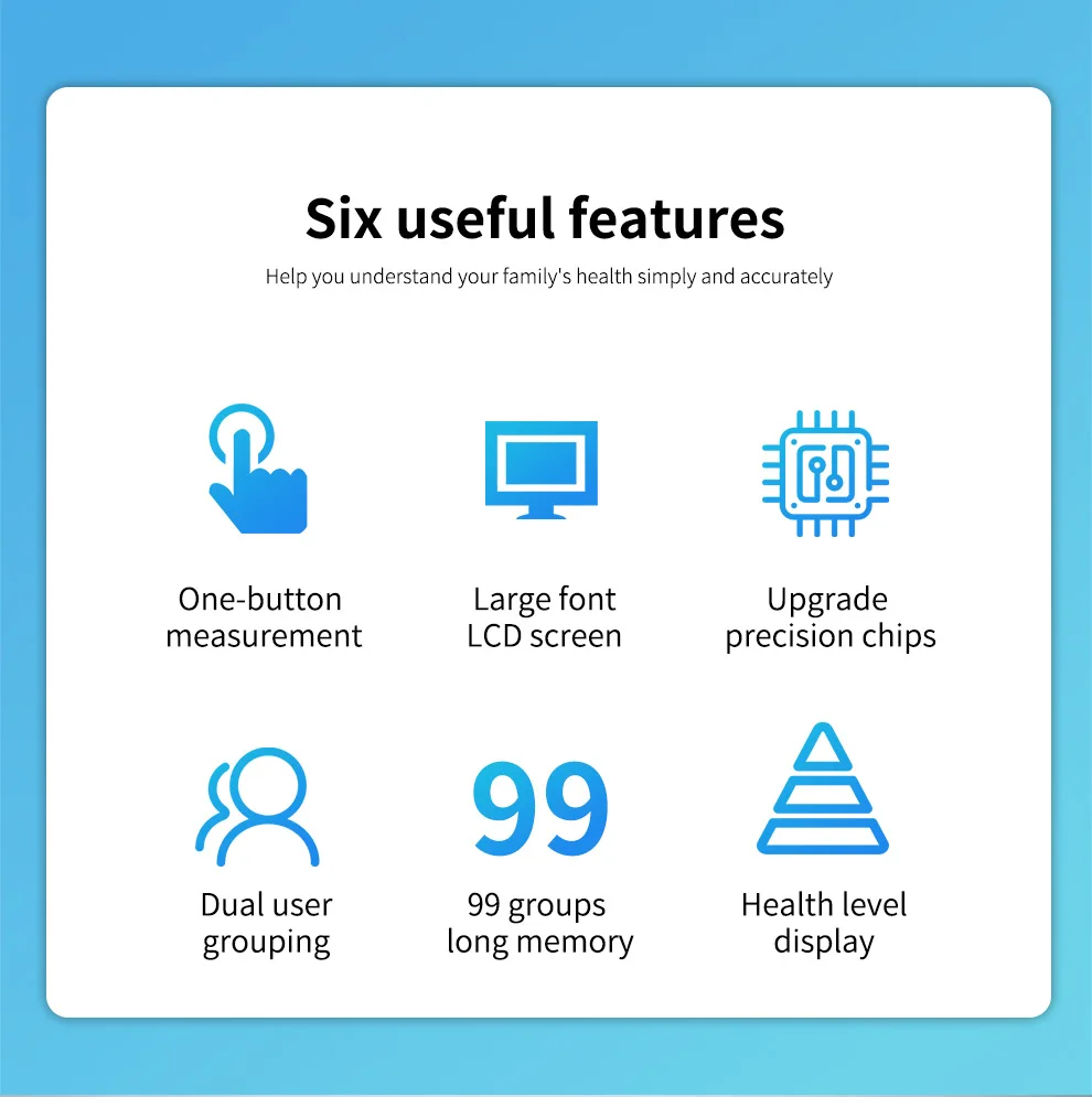 Интеллектуальная защита от избыточного давления-первый вес Автоматически отрегулировать значение давления в соответствии с кровяным давлением testee-второй вес Выберите надувные измерения с коротким временем измерения, чтобы уменьшить Дискомфорт во время измерения-третий