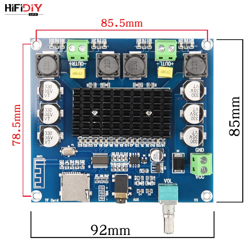 1. Режим работы: Класс D 2. Аудио вход: Поддержка bluetooth, TIF карты, AUX аналоговый сигнал 3. Номинальная выходная мощность: 100 Вт + 100 Вт 4. Частотная характеристика: 20 Гц-20 кГц 5. Рабочее напряжение: от DC12V до DC30V 6. Рекомендуемое напряжение питания: DC19V 7. Параметры динамика: 4-8 Ом 8. Размер: 92*85*18 мм 9. Вес нетто: около 83 г
