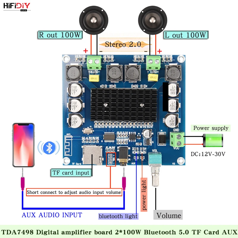 TDA7498 bluetooth усилитель мощности, используя оригинальный чип импортного усилителя мощности, имеет высокое качество стерео звука; Поддержка bluetooth, TIF карты, AUX вход аудио, конфигурация усилителя мощности bluetooth 5,0 Высокоскоростная передача, поддержка форматов воспроизведения музыки APE, FLAC, MP3, WAV, WMA, Например, музыкальный формат может быть декодирован основным рынком, если мобильный телефон может воспроизводить этот bluetooth, не влияет на расстояние не будет caton. Bluetooth эффективное расстояние передачи 20 метров беспрепятственное соединение, но в соответствии с персональной конфигурацией телефона bluetooth, сила сигнала отличается, расстояние передачи будет зазором. Усилитель мощности, Входная мощность для DC12-30 в, имеет двойной звуковой канал, выходное сопротивление 4-82, максимальная мощность 100 w2; Встроенный потенциометр громкости, свободно регулировать громкость.