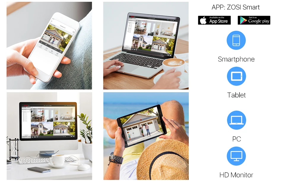 Просмотр в реальном времени или воспроизведение в любое время в любом месте на смартфоне, планшете, ПК и hd мониторе.
