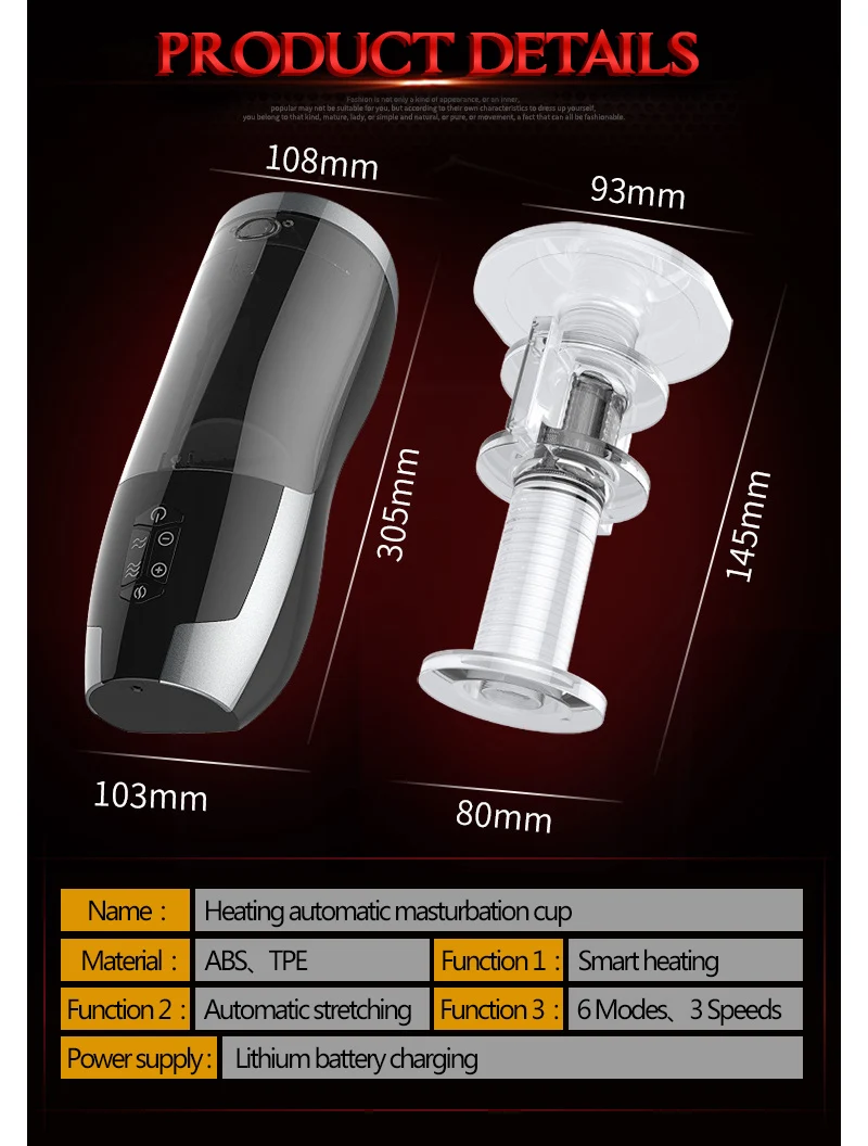 Тип: чашка для мастурбации Материал: Tpe + abs, Tpe + abs Название продукта: Автоматический Поршневой Телескопический мастурбатор для мастурбации с горячим нагревом Цвет: черный Стиль: мастурбатор Шум: Менее 45 дБ Время использования: 1,5 час Размер: 360*130*160 мм