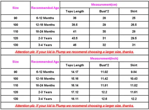 Size 110: Top Length 41cm, Bust 2x30cm, Skirt Length 28cm, Age 18-24 Months