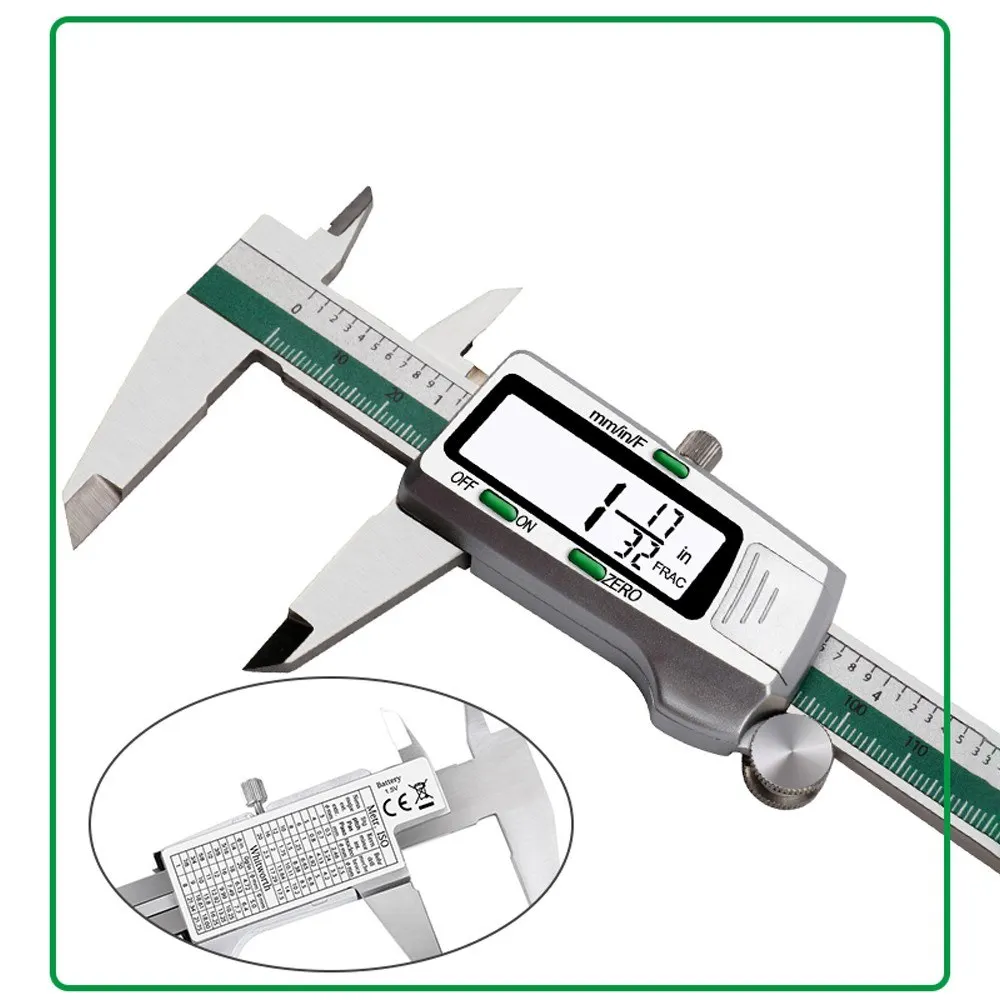 Электронный цифровой штангенциркуль позволяет точно измерять предметы в вашей жизни с помощью простой работы. В то же время вы можете прочитать данные измерений в реальном времени через дисплей. Измеренные значения также могут быть преобразованы между дюймами, миллиметрами и фракциями. Особенности: Изготовлен из нержавеющей стали, практичный, износостойкий и не ржавеет. Цифровой дисплей может считывать результаты измерений во времени, а измеренные значения могут быть преобразованы между дюймами, миллиметрами и фракциями. Операция проста, а лапы штангенциркуля прочные и прочные. С выключателем питания (вкл/выкл), нулевым калибровочным переключателем, дюймами, миллиметрами и переключателем преобразования фракций. Диапазон измерения: 0-150 мм, разрешение 0,01 мм. Технические характеристики: Материал: нержавеющая сталь Цвет: серебристый + зеленый Диапазон измерения: 0-150 мм/0-6,0 дюйма Разрешение: 0,01 мм Точность: ± 0,04 мм Кнопка: мм/дюйм/Ф, вкл/выкл, ноль Аккумулятор: 1 * LR44 кнопочный аккумулятор, 1,5 в, 160 мА · ч (в комплекте) Общая длина: 236 мм/9,3 дюйма Размер посылка: 242*90*27 мм/9,5*3,5 * 1.1in Посылка Вес: 290 г/10,2 унции Посылка список: 1 * Цифровой Штангенциркуль с нониусом 1 * коробка 1 * Руководство пользователя
