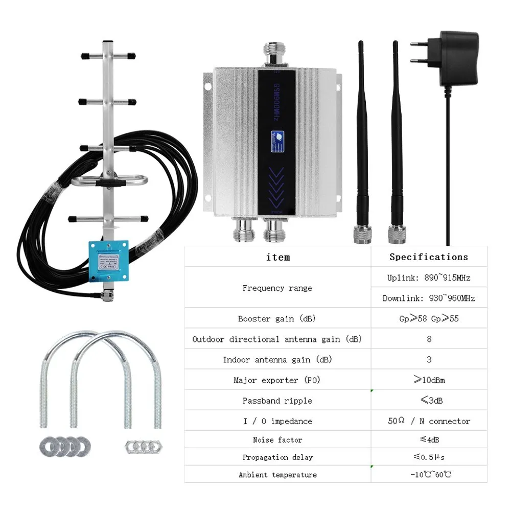 Устройство отличается простой установкой и работой и без помех. Это идеальное устройство для повышения сигнала на мобильный телефон. Ретранслятор на мобильный телефон также может улучшить электромагнетизм в помещении, продлить срок службы сотовой батареи и уменьшить излучение мобильных телефонов. Особенности: Функция ЖК-дисплея для отображения сигнала приема. Подходит для усиления сигнала слепых зон в различных внутренних местах, таких как конференц-залы, отели и большие здания. Расширьте зону покрытия сигнала базовой станции. Улучшает покрытие сигналов на мобильный телефон. Уменьшить излучение мобильный телефон к человеческому телу. Увеличьте время и срок службы батареи на мобильный телефон. Простота установки, экологичность, малый размер, гибкая конфигурация в соответствии с конкретными видами применения. Полнодуплексная работа, высокая изоляция между восходящей и нисходящей связью, не будет мешать друг другу. С передовой технологией цифровой фильтрации, отторжение вне диапазона особенно хорошо. Наружный сигнал перелива мал и не мешает базовой станции принимать чувствительность. Процесс вызова гладкий, не застревает, не прерывается, повышает эффективность работы. Подходит для всех районов с плохим внутренним сигналом и без сигнала, таких как высотные здания, лифты, офисные здания, подвалы, KTV, яхты, городские деревни, туннели, отдаленные горные районы, И т. д. Характеристики: Материал: металл Цвет: серебристый + серый Частотный диапазон: Подключение: 890 ~ 915 МГц Downlink: 930 ~ 960 МГц Усиление усилителя (дБ): Gp≥ 58 Gp≥ 55 Коэффициент усиления наружной направленной антенны (дБ): 8 Коэффициент усиления внутренней антенны (дБ): 3 Крупный экспортер (PO): ≥ 10 дБм Пульсация полосы пропускания: ≤ 3 дБ Сопротивление ввода/вывода: 50 Ω / N разъем Коэффициент шума: ≤ 4 дБ Задержка распространения: ≤ 0,5 мкс Температура окружающей среды: -10 ℃ ~ 60 ℃ Размер изделия: 140*100*20 мм/5,5*3,9 * 0.8in Вес товара: 250 г/8,8 унции Размер посылка: 480*200*150 мм/18,9*7,9*5,9 дюймов Посылка Вес: 1400 г/3.1lb Примечание: Пожалуйста, подтвердите локальный Частотный диапазон при покупке. Посылка: 1 * повторитель сигнала мобильного телефона 2 * Внутренняя антенна 1 * Адаптер питания 1 * наружная антенна Yagi с кабелем 10 метров 1 * набор монтажных аксессуаров 1 * Руководство пользователя