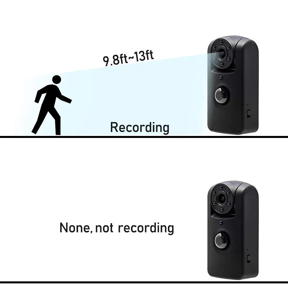 1 ПИР Индукционное Обнаружение движения тела 2 6 светодиодных ИК-ламп ночного видения, без светильник даже в темную ночь 3 объектива можно поворачивать на 180 градусов по мере необходимости 4 долгое время ожидания для низких энергопотреблений Широкоугольный объектив 5 140 6 маленьких размеров, чтобы найти в любом месте, где вам нравится 7. В течение 5 часов после полной зарядки.