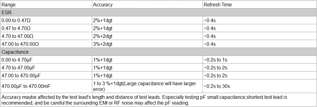 Дисплей: цифровой ЖК-дисплей Точность: до 1% (подробности на вышеуказанной таблице) Высокое разрешение: 5 цифр Измерительное напряжение: <0,8 В Напряжение зажима: ~ 1,25 в (открытое напряжение) Батарея: встроенный 3,7 V 1200 мА/ч, Перезаряжаемые литий-ионный Батарея Внешняя мощность: 5 В Micro USB Рабочий ток 0.02A (средний) Размер изделия: 145*80*30 мм/5,7*3,15*1,18 дюймов Вес изделия: 160 г/5,67 унций Размер посылка: 16*9*5 см/6,3*3,54 * 1.97in Вес посылка: 250 г/8,83 унций Посылка: 1 * измеритель ESR 1 * пара тестовых зажимов SMD 1 * Руководство пользователя (на английском языке)