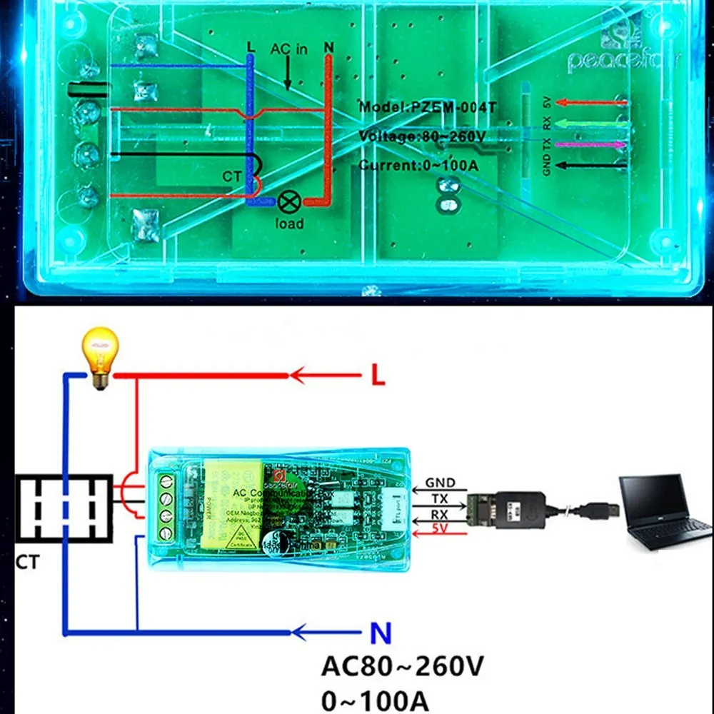 Этот модуль в основном используется для измерения напряжения переменного тока, тока, активной мощности и активной энергии, модуль не имеет функции отображения, данные считываются через интерфейс TTL. Особенности: Функция измерения электрических параметров (напряжение, ток, активная мощность, энергия). Функция сброса энергетического ключа. Может хранить данные при отключении питания (храните накопленную энергию перед выключением питания). Функция дисплея ПК (напряжение дисплея, ток, активная мощность, энергия). Функция последовательной связи (с TTL последовательным интерфейсом, может общаться с различными клеммами через пин-плату, считывать и устанавливать параметры). Характеристики: Материал: PCB Тип: PZEM-004T вольтметр переменного тока Амперметр + Трансформатор катушки, PZEM-004T вольтметр переменного тока Амперметр + Трансформатор катушки + usb-контактный разъем (опционально) Рабочее напряжение: 80 ~ 260 В переменного тока Испытательное напряжение: 80 ~ 260 В переменного тока Номинальная мощность: 100А/22000 Вт Рабочая частота: 45-65 Гц Точность измерения: 1,0 класс PZEM-004T вольтметр переменного тока Амперметр Размер: 73,7*30*16 мм/2,9*1,2 * 0.6in Размер посылка: 110*60*30 мм/4,3*2,4*1,2 дюйма Посылка: PZEM-004T вольтметр переменного тока Амперметр + трансформатор катушки: 65 г/2,3 унции PZEM-004T Амперметр Вольтметр переменного тока + трансформатор катушки + плата адаптера USB: 106 г/3,7 унции Формат дисплея: Мощность: Диапазон испытаний: 0 ~ 22 кВт В пределах 0 ~ 10 кВт Формат дисплея составляет 0,000 ~ 9,999 В пределах 10 ~ 22 кВт Формат дисплея 10,00 ~ 22,00 Энергия: Диапазон испытаний: 0 ~ 9999kWh В пределах 0 ~ 10 кВтч Формат дисплея составляет 0,000 ~ 9,999; В течение 10 ~ 100 кВт · ч Формат дисплея 10,00 ~ 99,99; В пределах 100 ~ 1000 кВт · ч Формат дисплея составляет 100,0 ~ 999,9; 1000 ~ 9999kWh и выше, Формат дисплея 1000 ~ 9999 Напряжение: Диапазон испытаний: 80 ~ 260 В переменного тока Формат дисплея: 110,0 ~ 220,0 Ток: Диапазон испытаний: 0 ~ 100A Формат дисплея: 00,00 ~ 99,99 Примечание: 1. Этот модуль подходит для помещений, пожалуйста, не используйте на открытом воздухе. 2. Приложенная нагрузка не должна превышать номинальную мощность. 3. Заказ проводки не может быть неправильным. 4. Этот модуль оснащен TTL последовательным интерфейсом передачи данных, вы можете читать и устанавливать соответствующие параметры через последовательный порт; но если вы хотите связаться с устройством, которое имеет USB или RS232 (например, компьютер), вы должны быть оснащены другой TTL pin-платой (Usb-коммуникация должна быть оснащена TTL-USB контактной платой; RS232 коммуникация должна быть оснащена TTL-RS232 контактной платой). Посылка: (опционально) Тип 1: 1 * PZEM-004T амперметр переменного тока 1 * катушка Трансформатора Тип 2: 1 * PZEM-004T амперметр переменного тока 1 * катушка Трансформатора 1 * USB Pin Board
